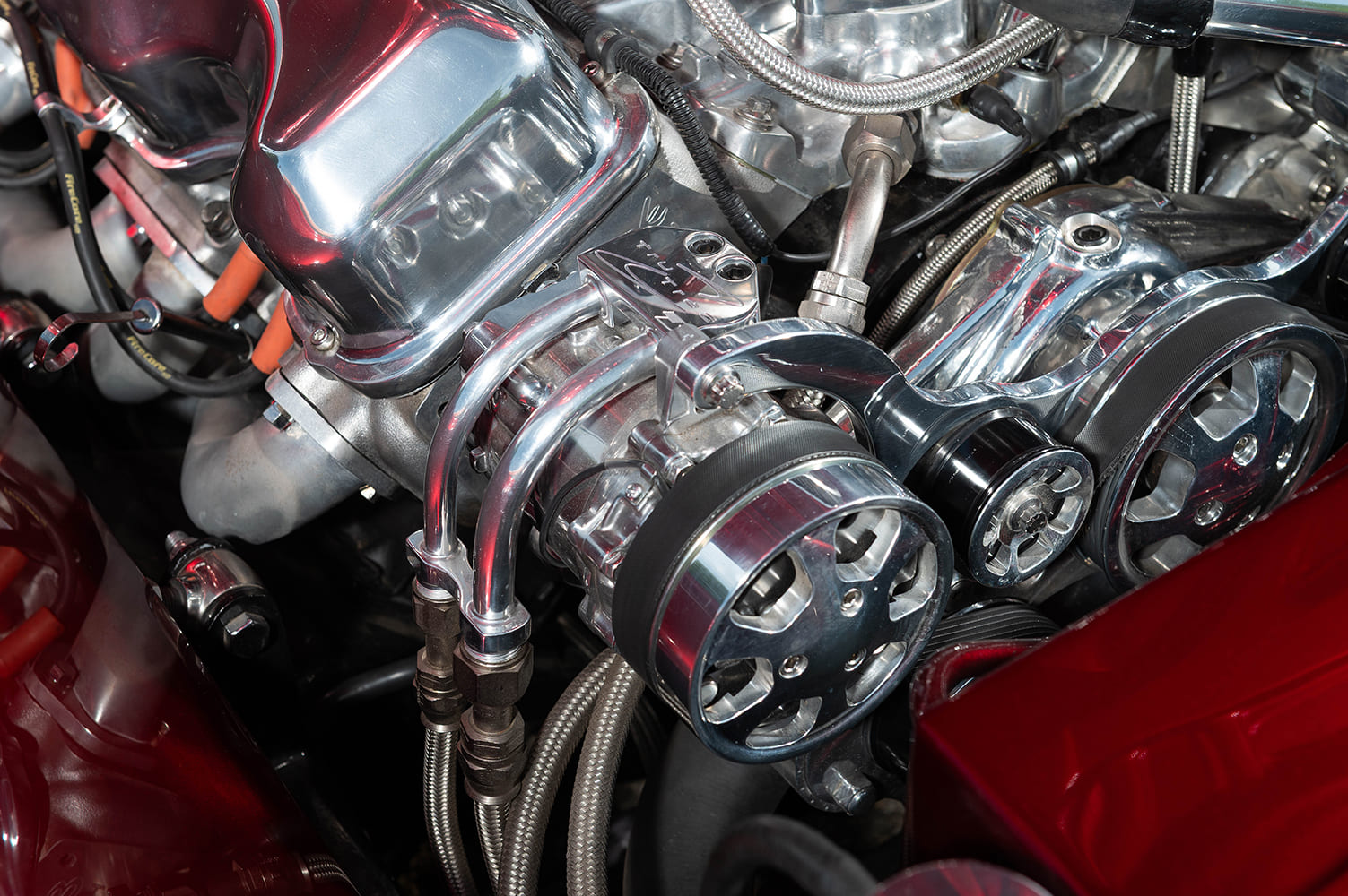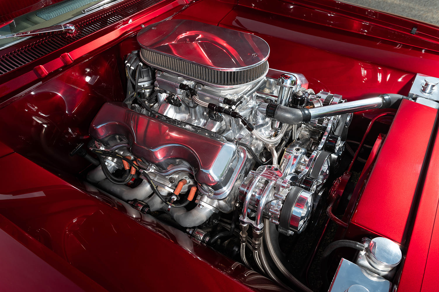 11 1962 Chevy Impala engine bay candy red radiator cover billet fan shroud braided hoses
