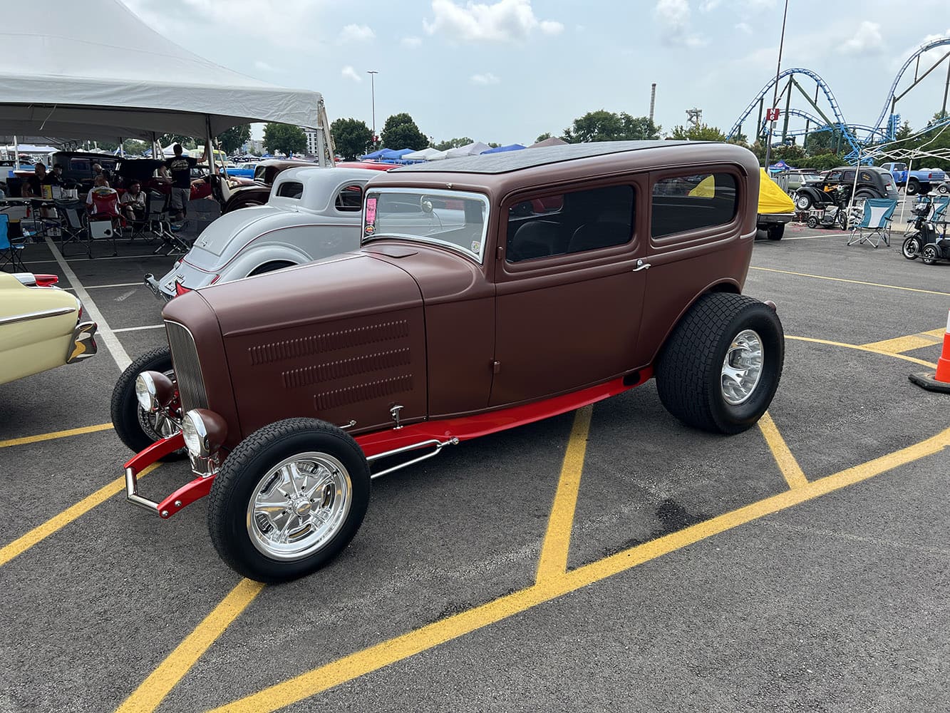Lil’ Meade Baldwin of Annapolis, MD, brought out another example of a primered Deuce highboy, this time a Tudor sedan. The painted undercarriage and the Halibrand wheels do give a distinctive hot rod look.