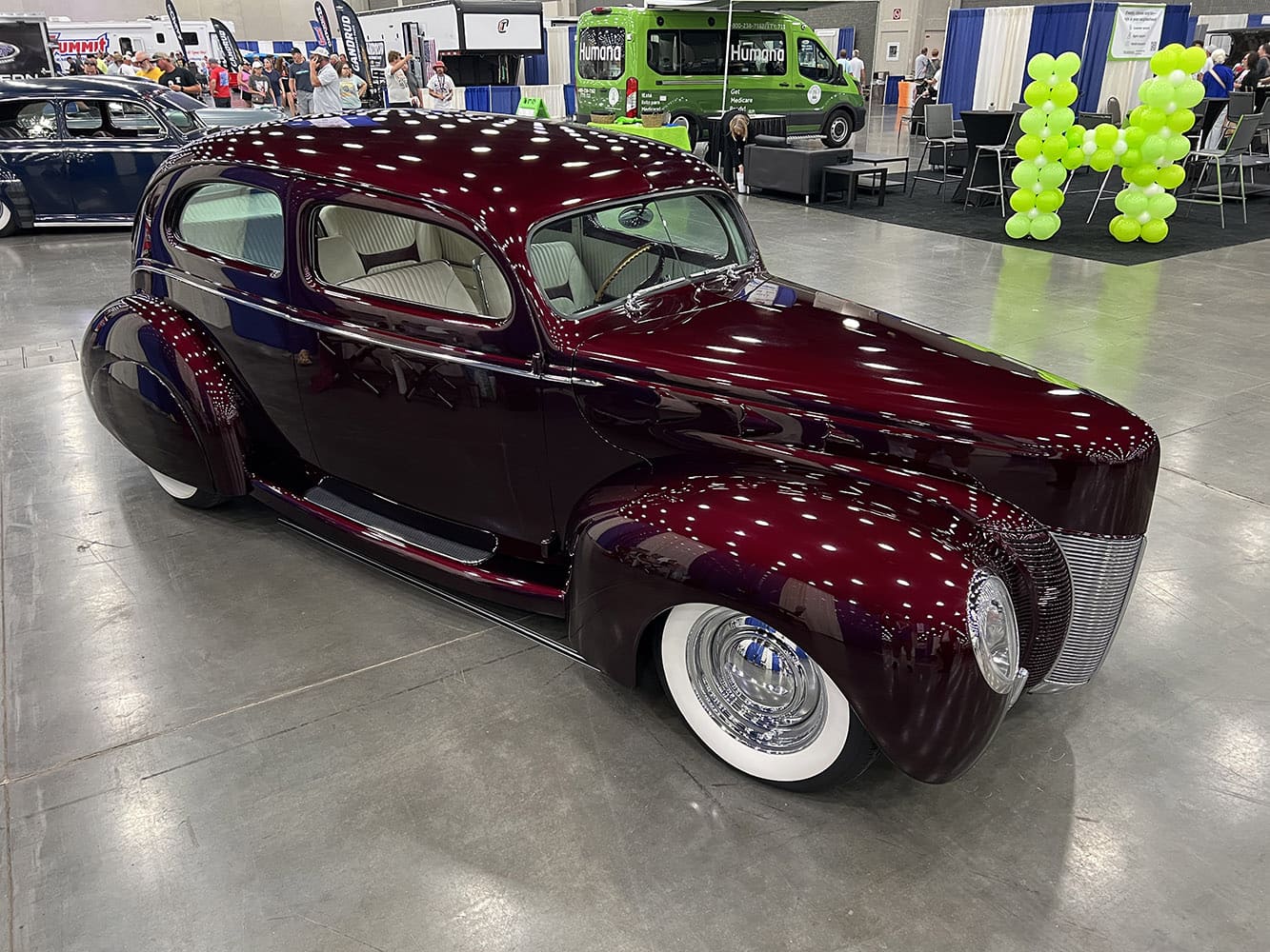Steve Henry of Princeton, KY, brought his 1940 Ford sedan for display inside the main building. Featuring a 2-1/2-inch chop covered in Candy Brandywine over black, powered by a 1964 Chevy 409 with a 700-R4 transmission and a Ford 8-inch rearend spinning 3.50 gears. Inside, a 1955 Chevy dash and 1964 Impala seating create a stunning appearance. The workmanship is impressive.
