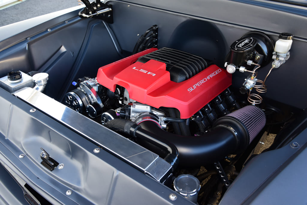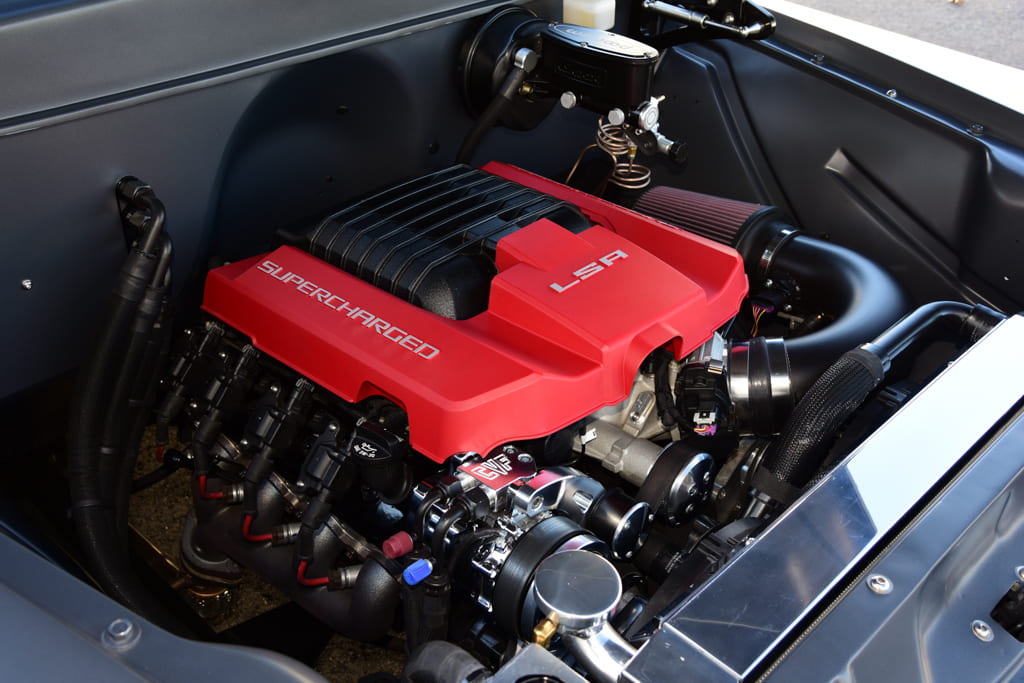 For plenty of thunder underhood, a call was made to Chevrolet Performance for one of their tire-searing, supercharged 6.2L LSA crate V-8s. It all starts with a cast-aluminum block featuring six-bolt cross-bolted main caps packing a forged steel crank linked to forged powdered metal rods capped by hypereutectic aluminum pistons getting bumped by a hydraulic roller cam. Up top, a set of high-flow A356-T6 Rotocast aluminum, L92-style port heads generate seamless power while a 1.9L supercharger with four-lobe high-twist rotors, 87mm throttle body, and EFI deliver the dynamite. It’s all good for a stout 556 hp and 551 lb-ft of torque. Factory direct-mount ignition coils spark it to life with hot gases dumping through Chevrolet Performance cast-iron headers to a custom 3-inch stainless exhaust by BVA with Borla mufflers. Other neat bits include a CVF Racing eight-rib serpentine system and custom K&N cold air intake. To move the goods, a TREMEC T56 six-speed manual trans links to a custom driveshaft for fast getaways.