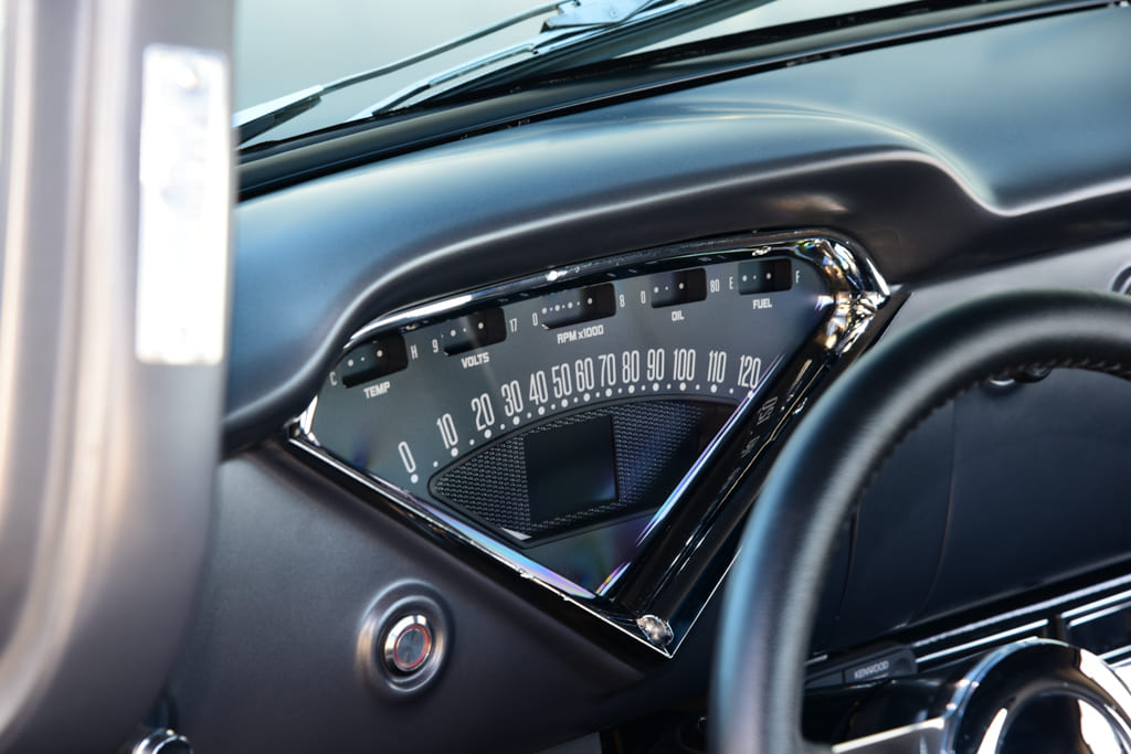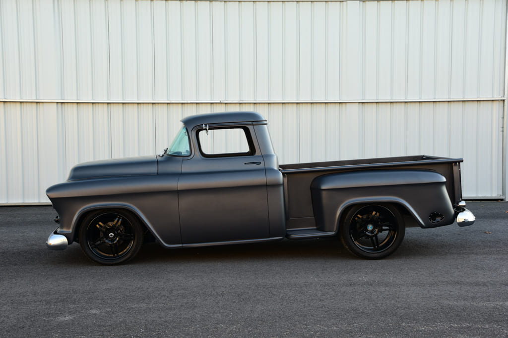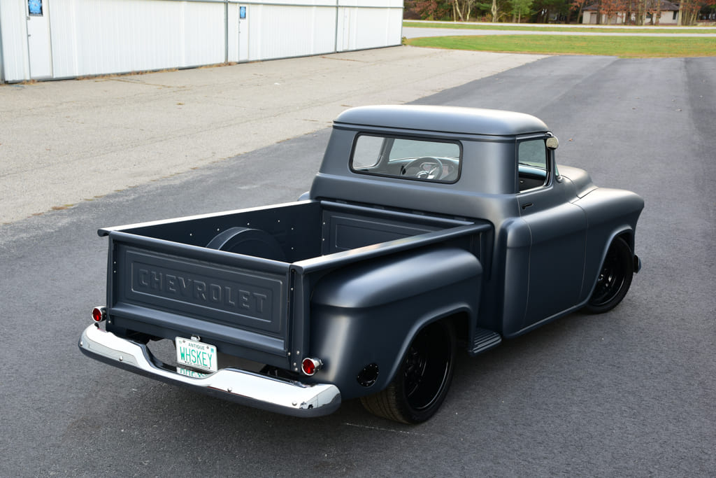 Once the factory sheetmetal returned from the blasters, it was easy to see that the cab had clearly seen better days, while, surprisingly, the bed was salvageable. Matt Day and the team outlined a plan of attack focusing on all the replacement sheetmetal needed to bring the cab back to life. A call was placed to LMC Truck to order a bevy of parts to begin the resurrection. Starting at the top, the roof panel was replaced followed by both A-pillars with kick panels, rear cab panel, firewall, rockers, and complete floors. From there the roof was chopped a perfectly balanced 3½ inches along with Kindig-It Design Spoon-Style door handles added. The firewall was then tunneled and shaved, a custom ’57 Chevy grille center bar was modified to float in the grille opening, exhaust cutouts to the rear fenders were fashioned, and the tailgate was modified for hidden latches. Once completed, the truck was then metal finished with all gaps set and massaged to perfection to prepare it for paint. Day then laid down the vibe with a subtle coating of RM Diamont Galaxy Gray satin metallic bringing the project to life. On reassembly, plenty of cool parts, included Eddie Motorsports hood hinges, fresh chrome bumpers and peep mirrors from LMC Truck, custom stained ash wood bed with stainless strips by BVA, and glass from American Auto Glass in Danvers, Massachusetts.