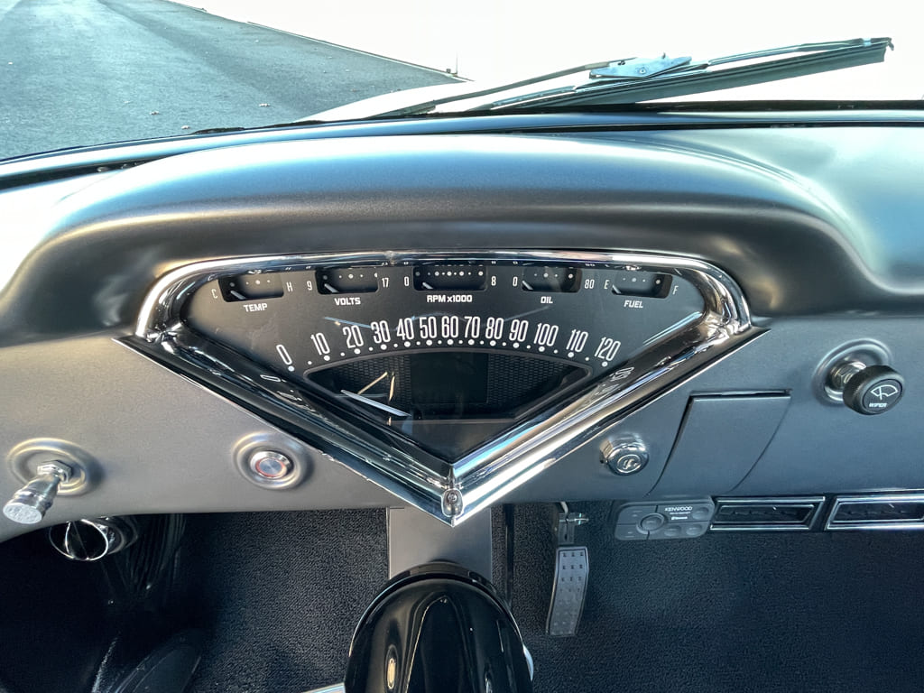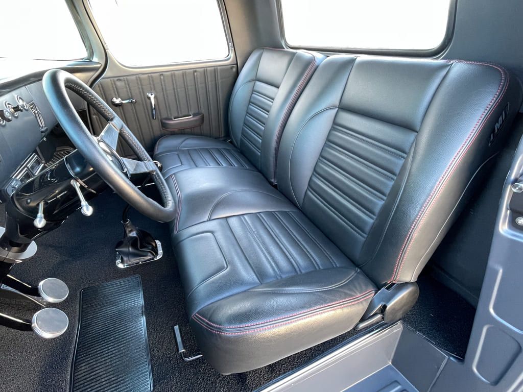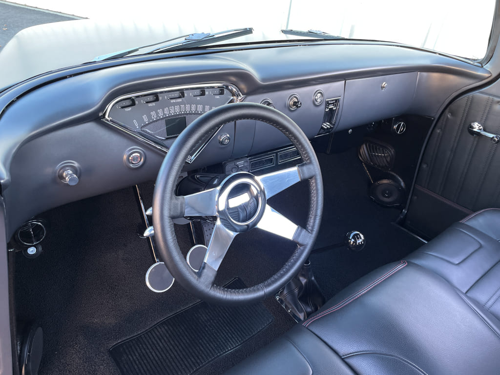 To bring an equal amount of allure inside, the restored factory dash was filled with Dakota Digital RTX-Series dials to monitor the vitals while Grant steering wheel carves a course through an ididit tilt column, with shifts moving though a custom stick by BVA. Cool breezes are compliments of Vintage Air, while Kenwood supplies the tunes with an American Autowire kit tying it all together. For plenty of comfort on the long haul, BVA installed a charcoal leather TMI Pro-Series Universal Sport Bench seat with complementing side panels and black loop carpeting. Since completion, Al has been laying down the miles all across New England and to us, that’s as good as it gets!