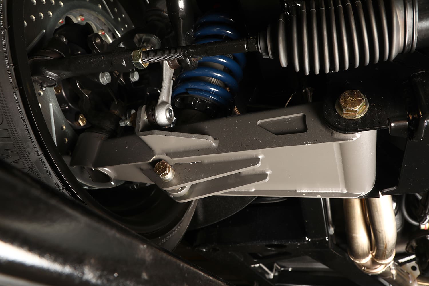 Front Suspension: Wilwood Pro spindles, Roadster Shop control arms, Fox coilover adjustable shocks, Hyperco springs, Roadster Shop sway bar, Unisteer rack-and-pinion steering
