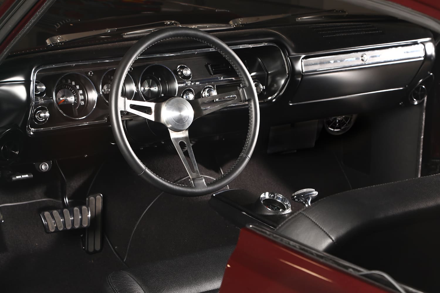 Inside, Stitches Custom Upholstery of Poulsbo, Washington, handled the all-leather interior. The stock bucket seats were re-foamed and wrapped in Bowen Foam & Fabrics leather, while the square-weave black carpet maintains the period vibe. A 15-inch Lecarra steering wheel sits on an Ididit tilt column, and the ’66 Chevelle console plays perfectly with the classic scene.