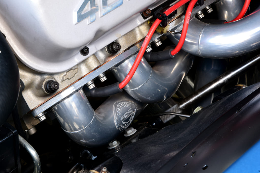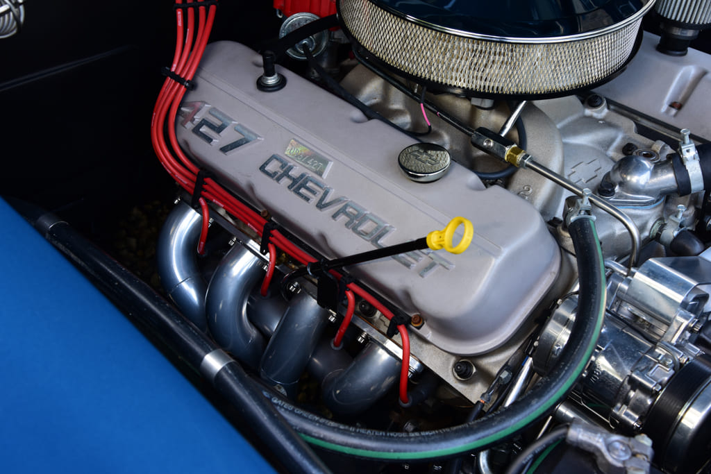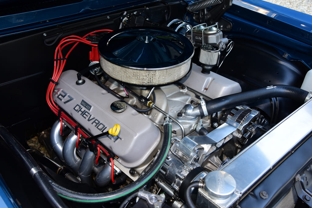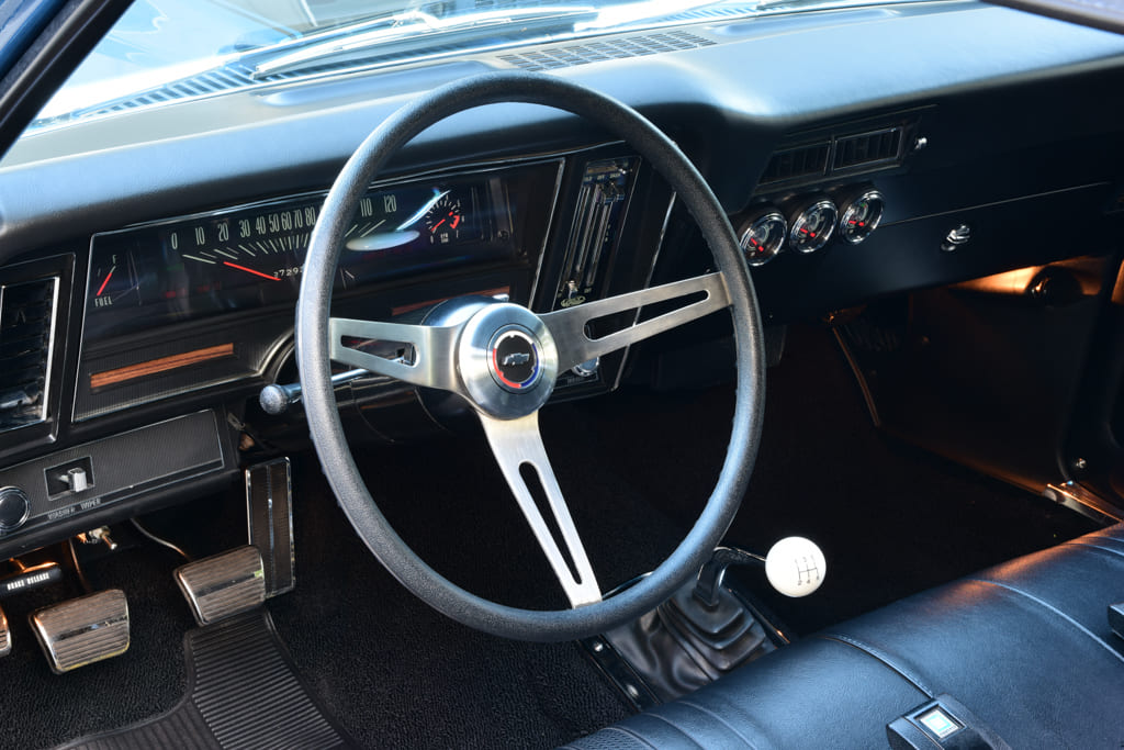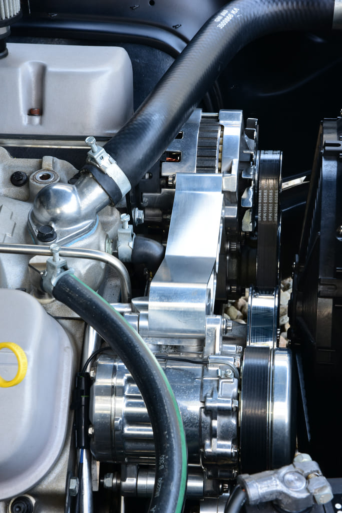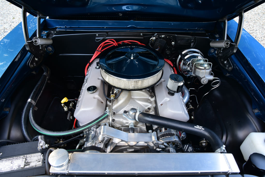 Up top you’ll find a set of aluminum oval-port heads with 110cc chambers topped by a matching high-flow aluminum oval-port intake pushing fuel through a Holley 770-cfm carb. Other cool bits include special aluminum production number valve covers, Vintage Air Front Runner drive system, and classic chrome air cleaner. A GM HEI ignition lights the fire with exhaust roaring through a set of Lemons stainless headers to a custom 2½-inch stainless exhaust by DMC with Flowmaster Delta Flow 50-Series mufflers. To move the goods, a TREMEC TKO 600 five-speed manual trans warmed over by Silver Sport Transmissions links to a custom driveshaft from Strange Engineering to move an estimated 430-plus horsepower to the rear wheels.