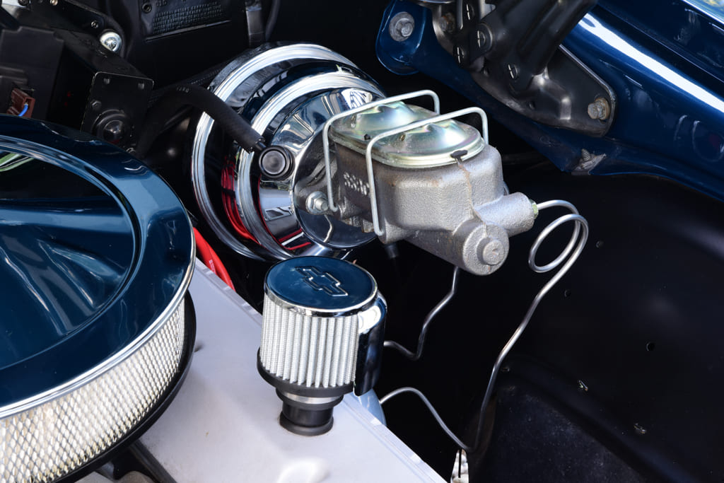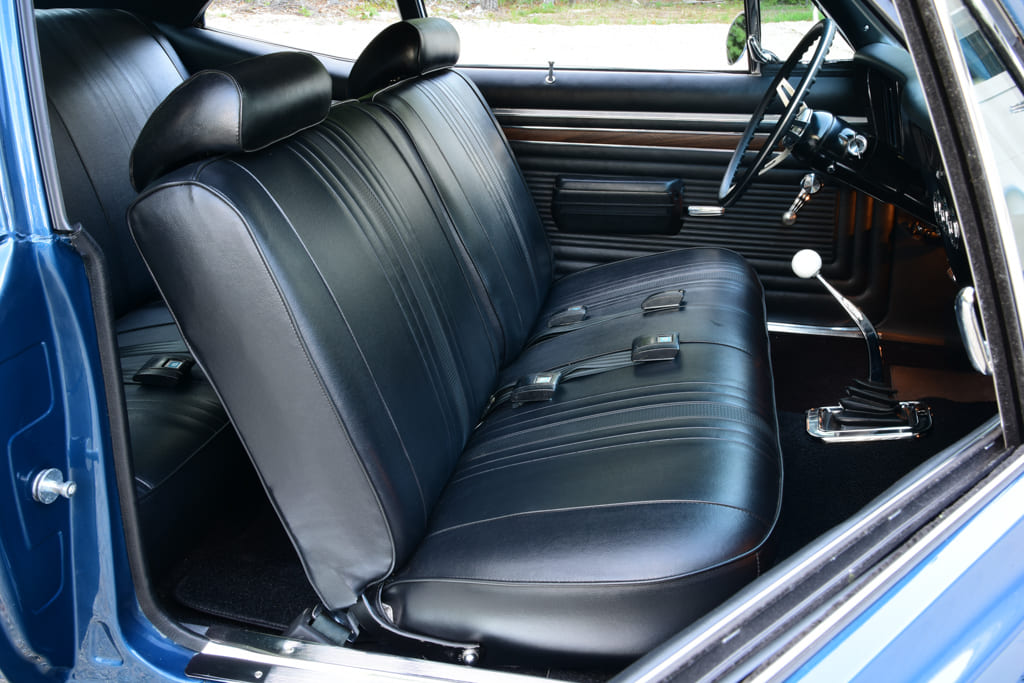 Wanting to bring a fresh look to the interior started with the factory dash filled with the original gauges restored by Instrument Specialties of North Kingstown, Rhode Island, which also added the Shiftworks tachometer while the Stewart-Warner Blue Line dials housed under the stock A/C vents remain. The original Comfort Grip three-spoke steering wheel carves a course through the restored factory column while shifts click though a Hurst Blackjack stick. Cool breezes are compliments of a Vintage Air SureFit system. Glynn Auto Upholstery out of Seekonk, Massachusetts, recovered the original bench and surrounding surfaces with OEM-style reproduction black vinyl from Classic Industries along with adding a new headliner and black loop carpeting.