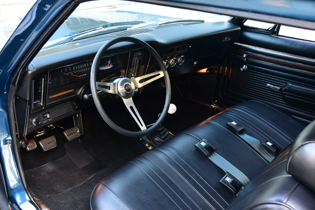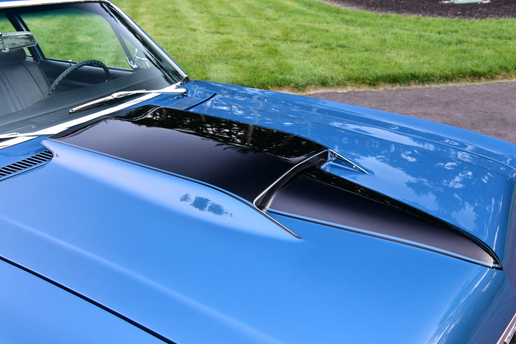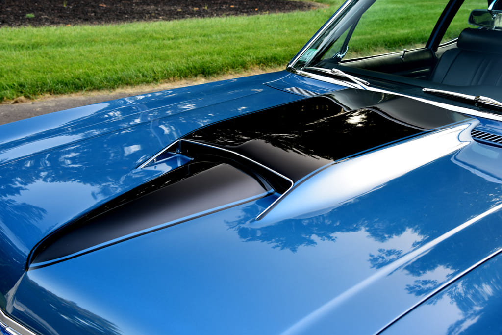With the car abused within an inch of its life and barely surviving the New England elements, Michael brought the car to Lowrey’s Auto Restoration in Tilton, New Hampshire, where Jim Lowrey and his talented team took on the sheetmetal restoration in preparation for paint. With the body stripped to bare metal it was determined new quarter-panels, rockers, and trunk floor would need to be sourced. Fresh Auto Metal Direct sheetmetal was used and the body metal-finished with all gaps set to perfection, with the crowning touch being a classic-looking VFN fiberglass Yenko-style hood.