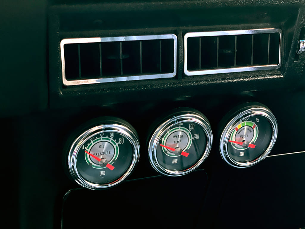 Gauges: Restored Original, Shiftworks tach, Stewart-Warner Blue Line trio