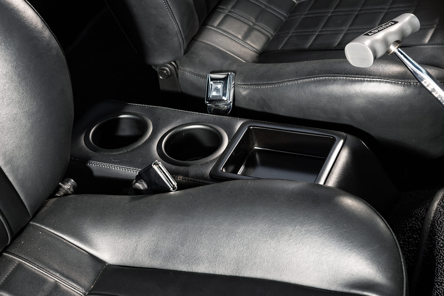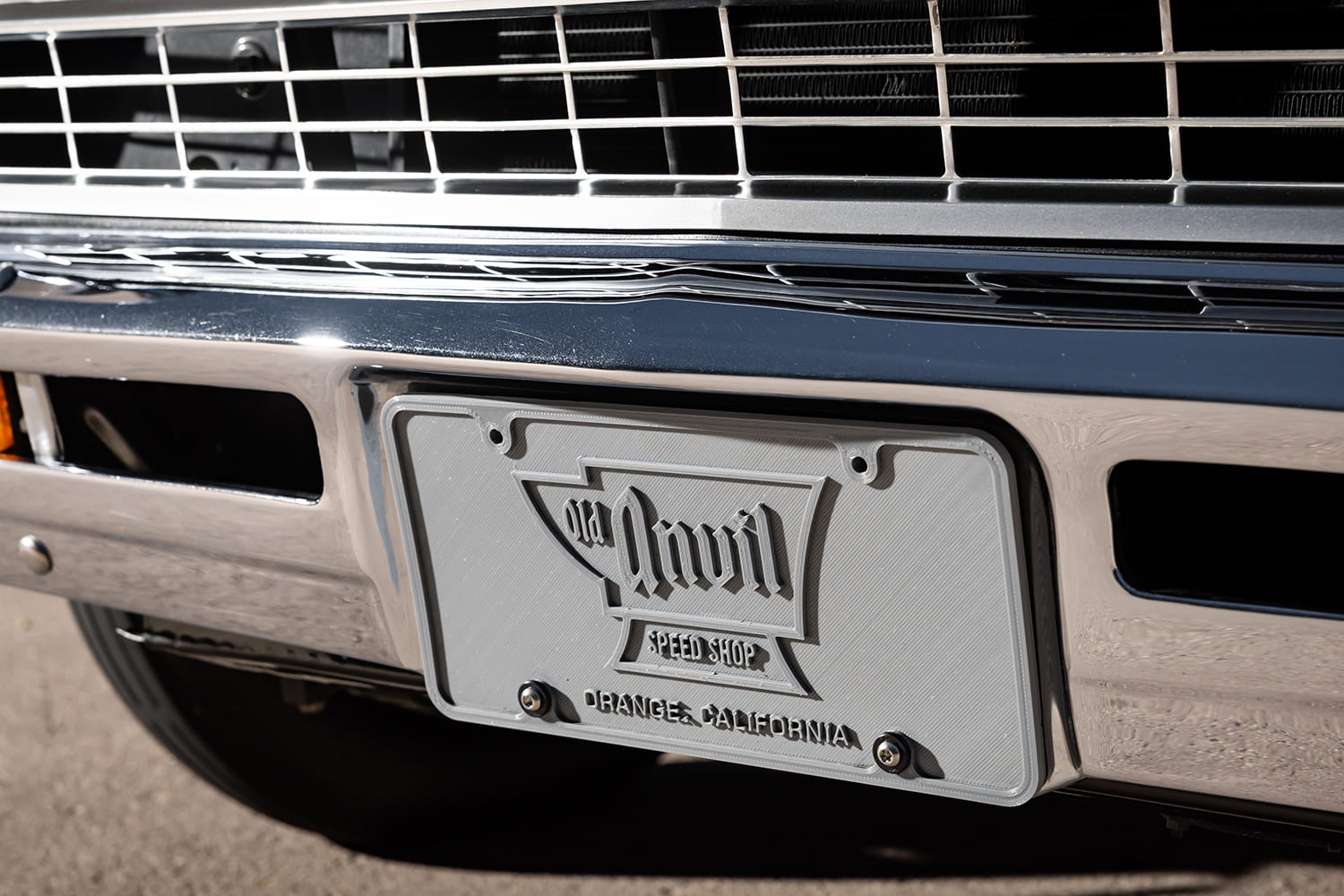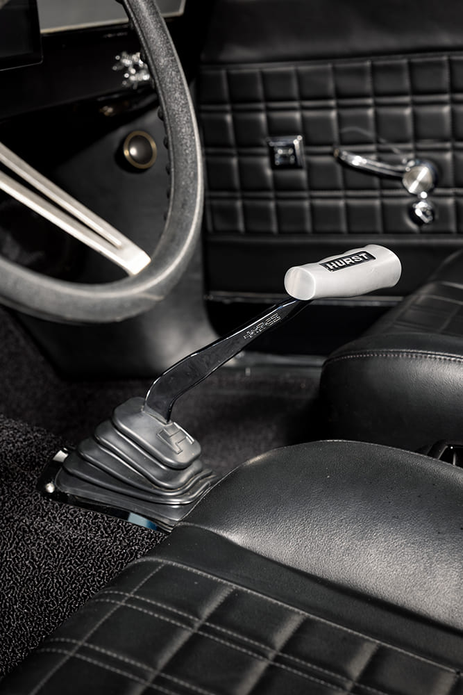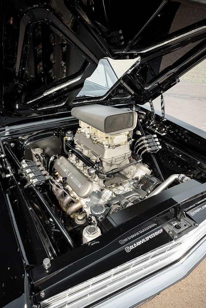 Remember that hood modification we mentioned? Well, the Old Anvil crew did make a sizable hole in the hood, eventually. When Chris delivered the car, it was equipped with an old-school 383 stroker small-block that was just too rowdy to handle on the streets. Plus, it was almost impossible to tune for some reason. In its place is a new 525hp LS3 crate engine outfitted with a Holley High Ram intake, dual 450-cfm carbs that act as throttle bodies, topped off with a custom scoop hand-crafted by Old Anvil, naturally. Backing all that is a five-speed TREMEC TKX transmission that harnesses the impressive power and torque the LS3 puts out.