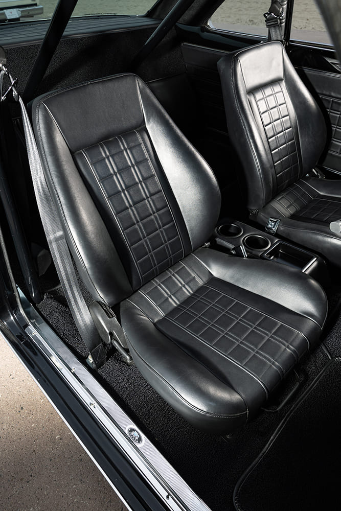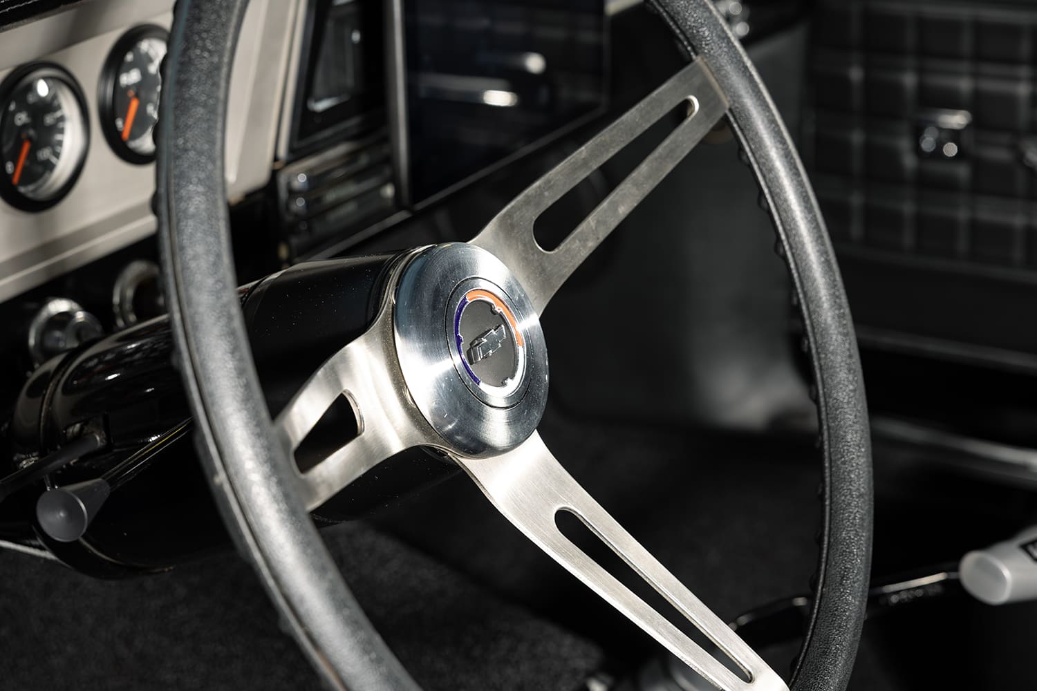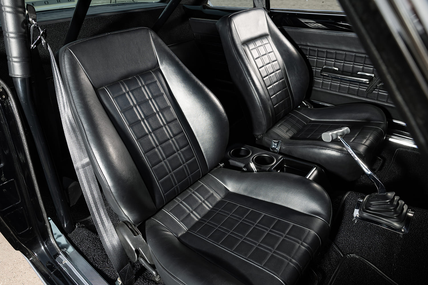 Remember that hood modification we mentioned? Well, the Old Anvil crew did make a sizable hole in the hood, eventually. When Chris delivered the car, it was equipped with an old-school 383 stroker small-block that was just too rowdy to handle on the streets. Plus, it was almost impossible to tune for some reason. In its place is a new 525hp LS3 crate engine outfitted with a Holley High Ram intake, dual 450-cfm carbs that act as throttle bodies, topped off with a custom scoop hand-crafted by Old Anvil, naturally. Backing all that is a five-speed TREMEC TKX transmission that harnesses the impressive power and torque the LS3 puts out.