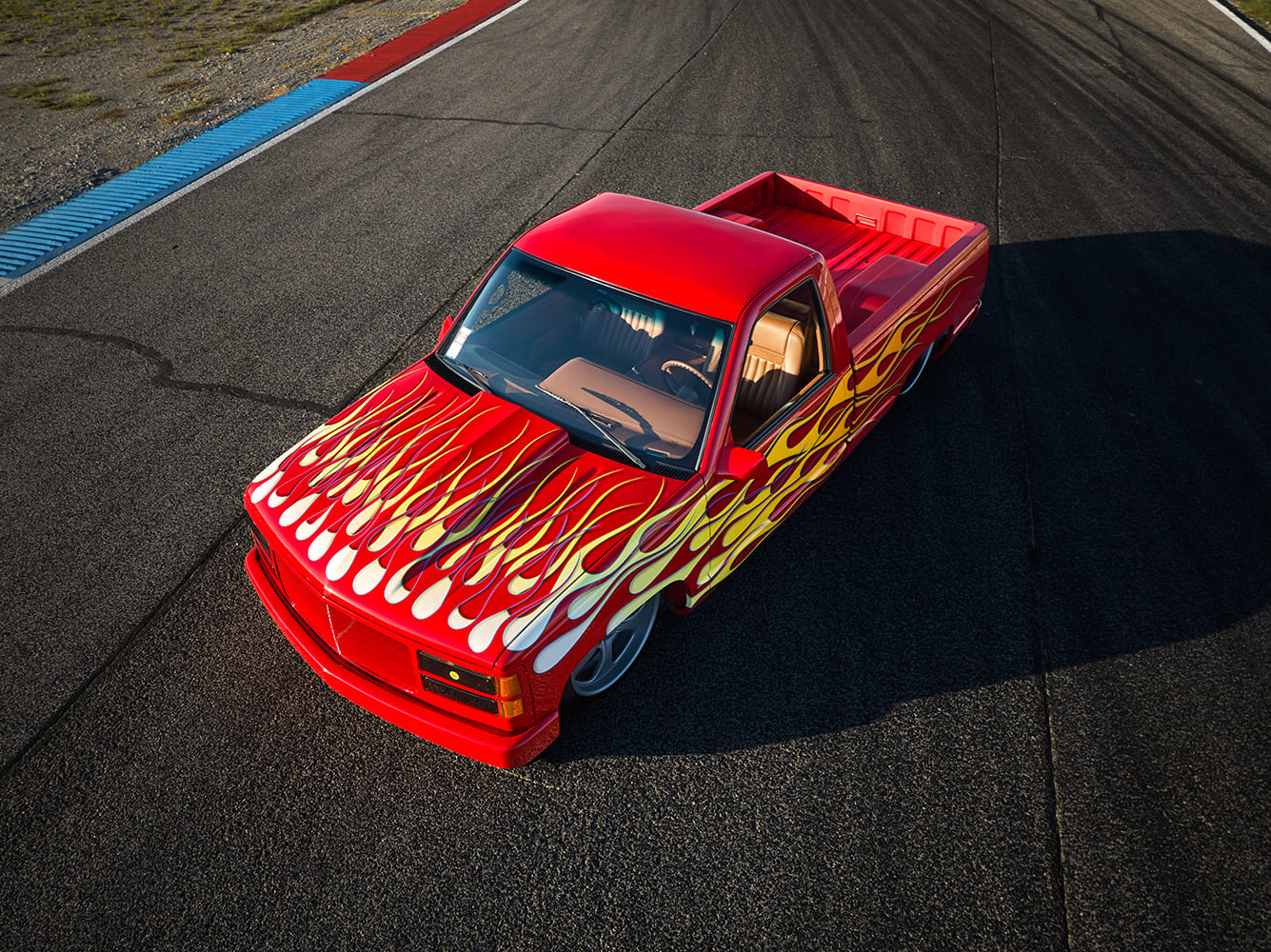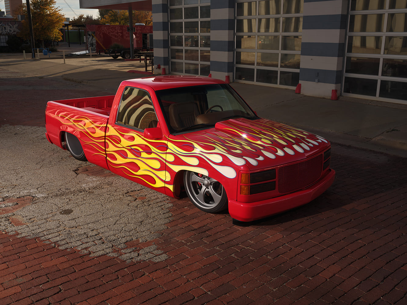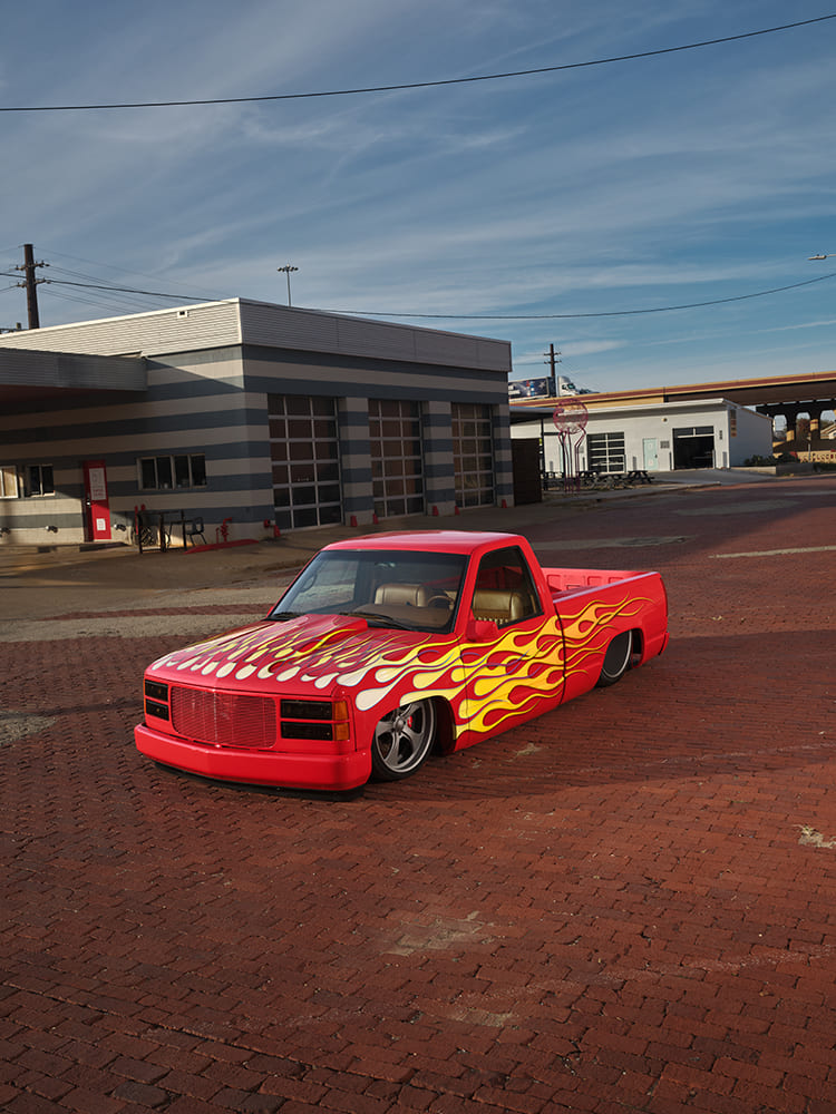 11 1996 Chevy C1500 with full tail shave and custom flame graphics sweeping into the bed