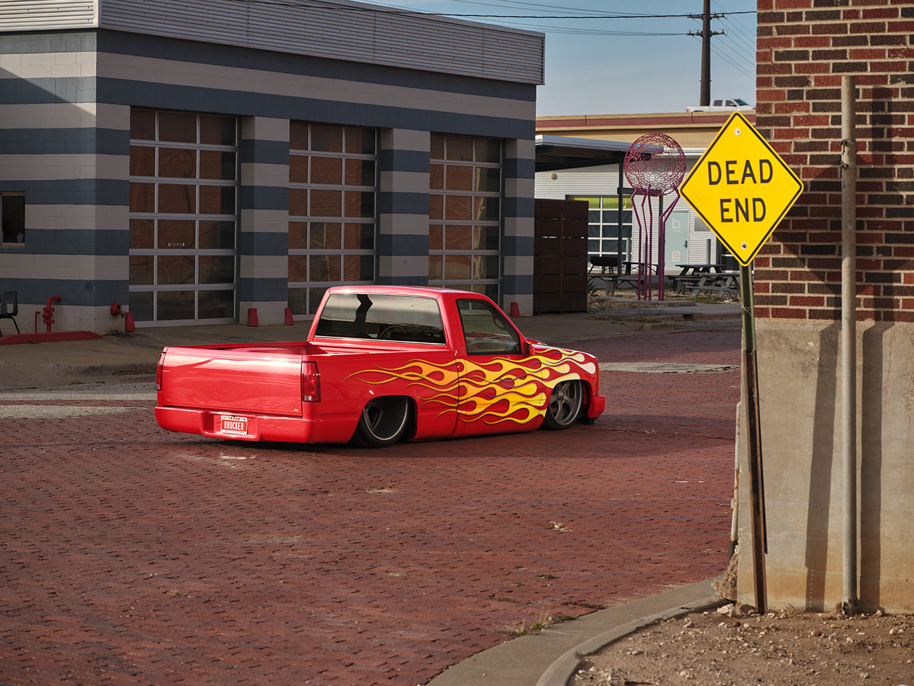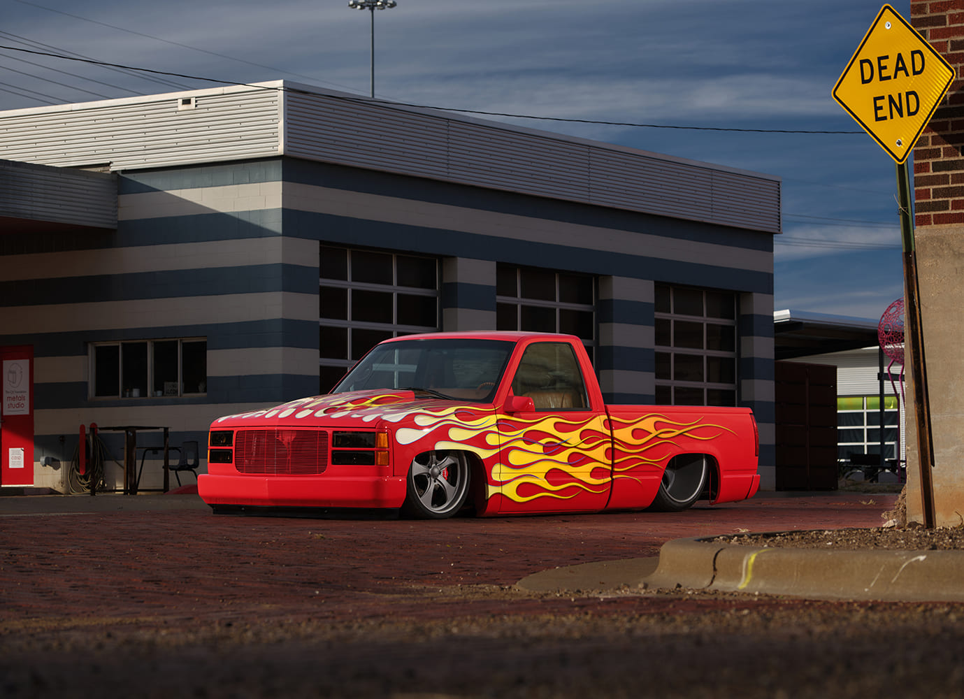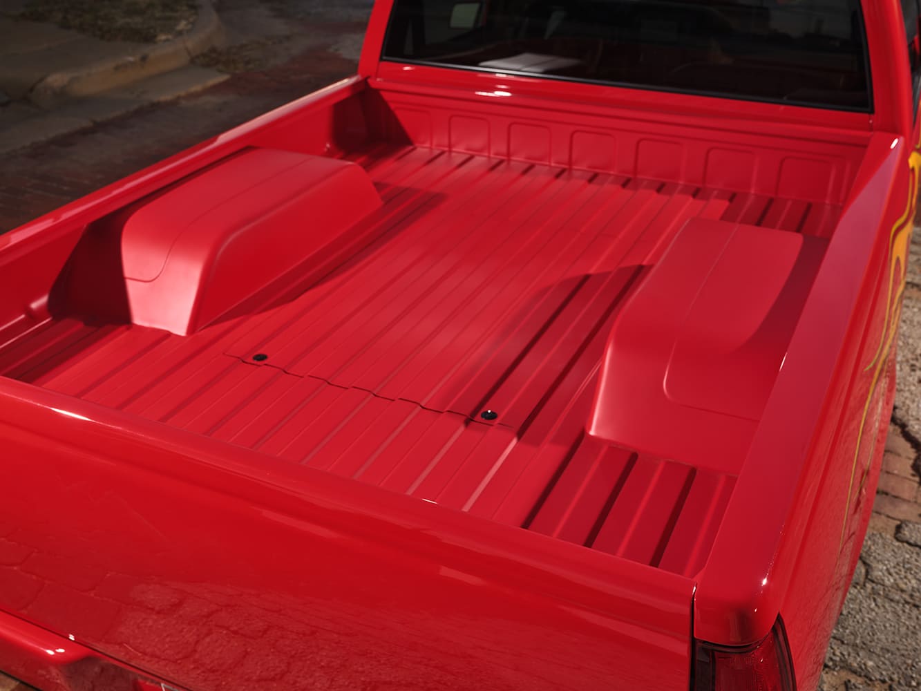 11 1996 Chevy C1500 with full tail shave and custom flame graphics sweeping into the bed