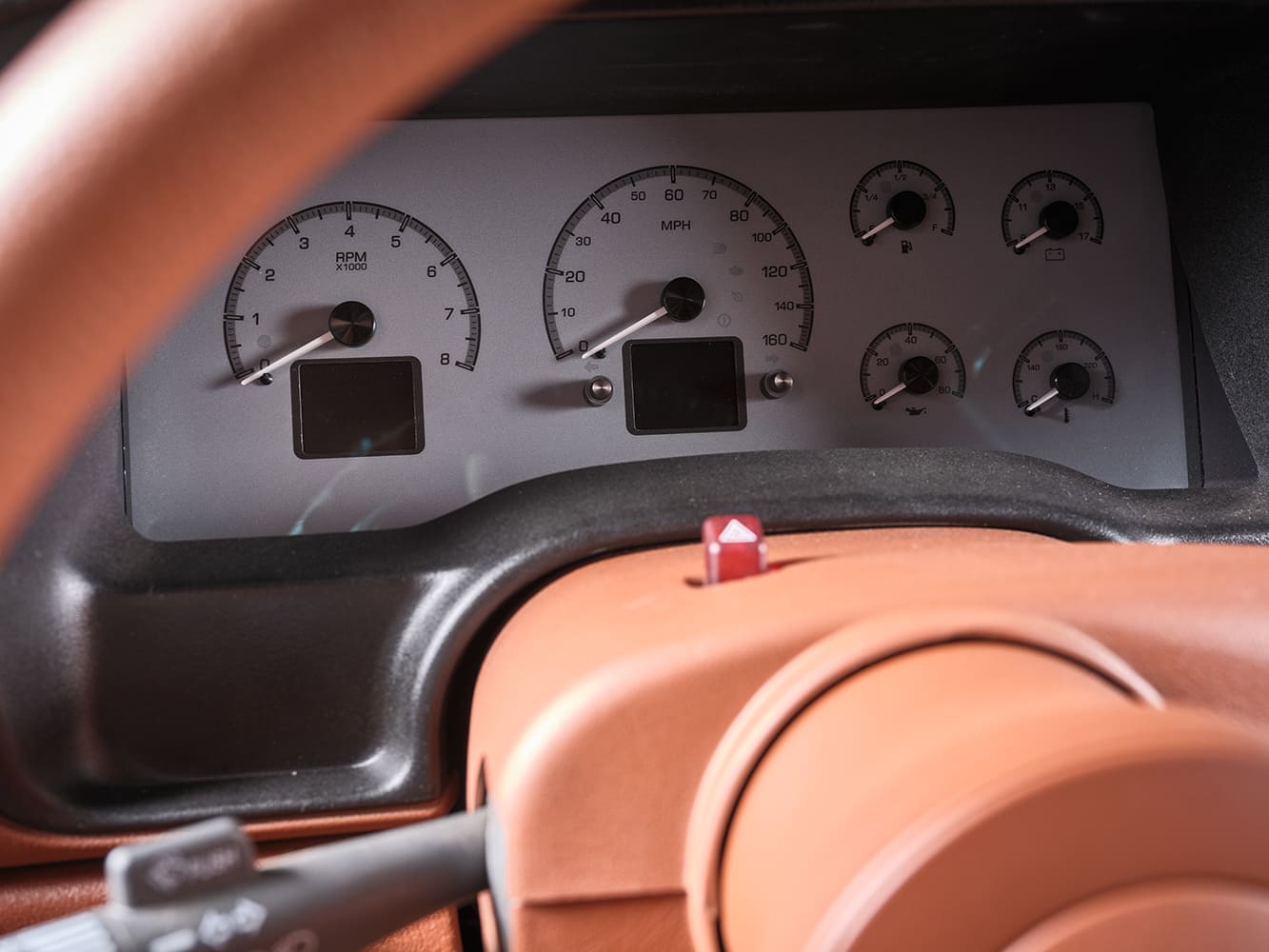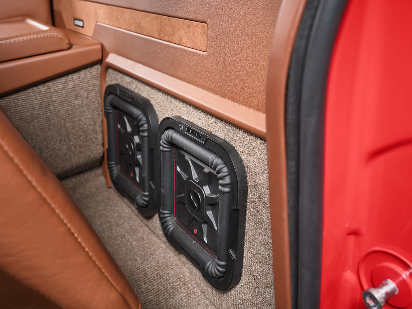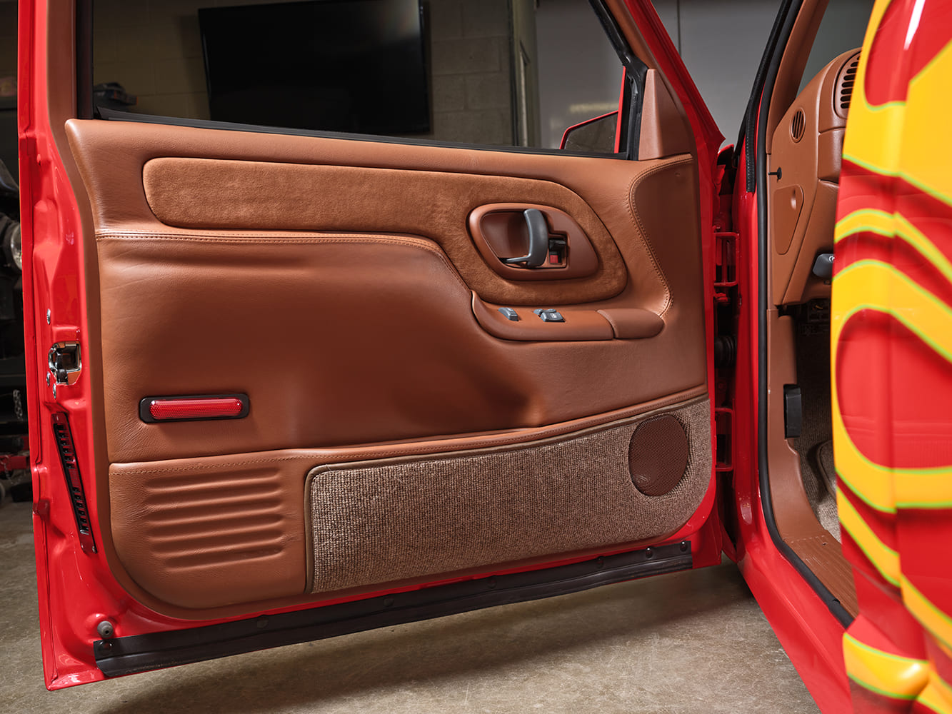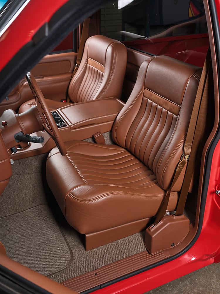 Lastly, after wiring and installing a full Kicker Audio system (obviously it has to have ample—heavy on the “amp”—output for the tunes!), JD Glassworks did their thing with yards of Moore & Giles hazelnut leather, from the dash to the Snowden bucket seats to the door panels and custom center console, all with complementing brown UltraSuede and medium brown Ultra square-weave carpet below. In the interior process, Dakota Digital HDX Silver Alloy gauges, painted/wrapped Billet Specialties steering wheel, and Vintage Air Gen 5 climate control were all added.