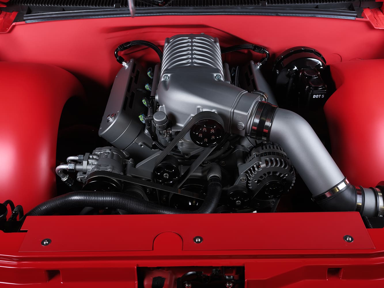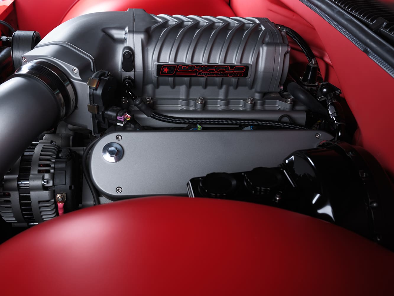 13 1996 Chevy truck engine bay featuring Whipple supercharger and billet accessories