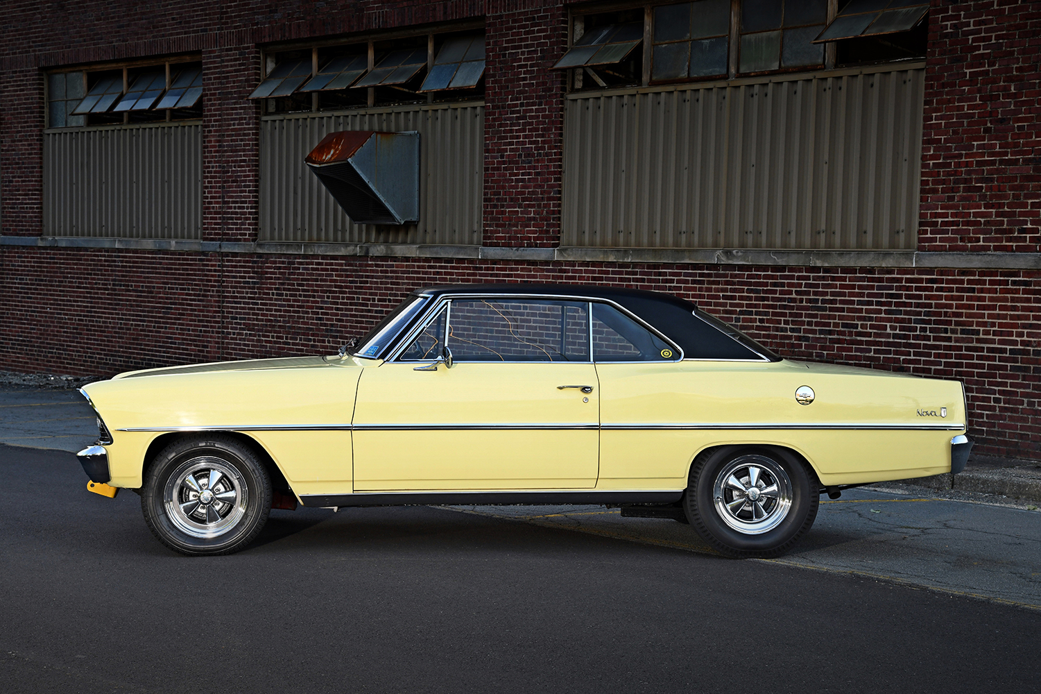 004 1967 Chevrolet Nova SS in yellow with black vinyl top chrome Cragar wheels parked by industrial brick walls