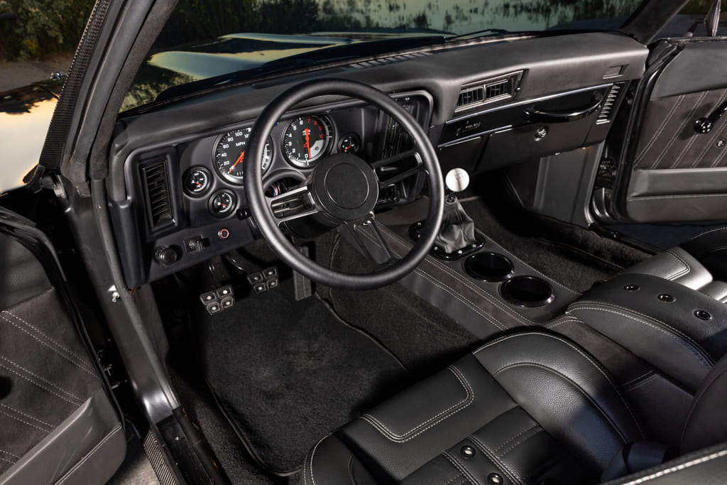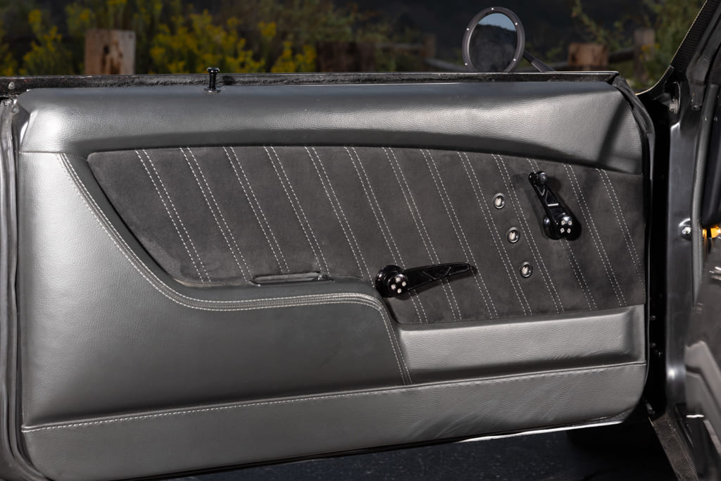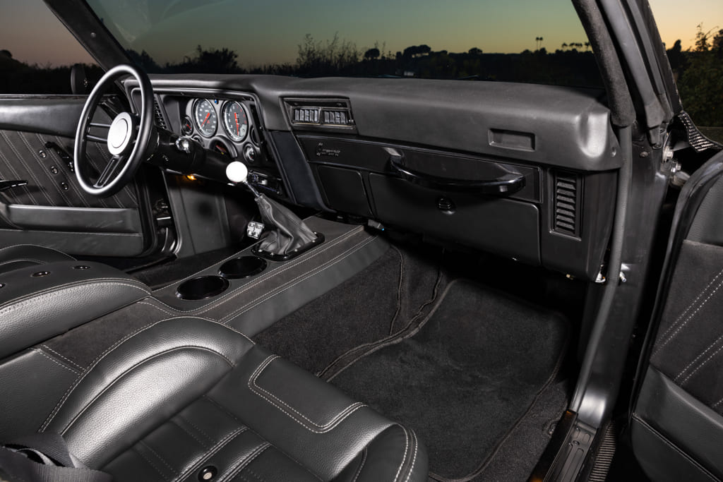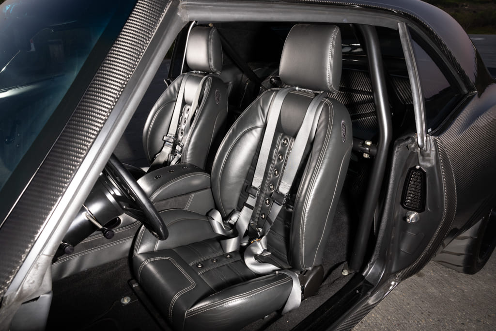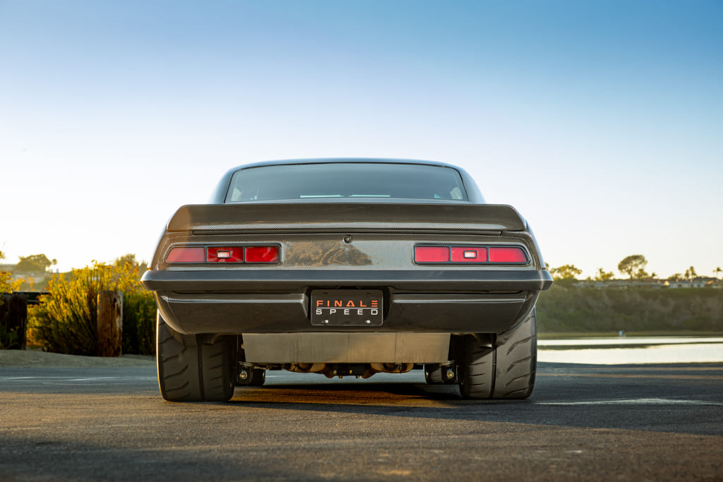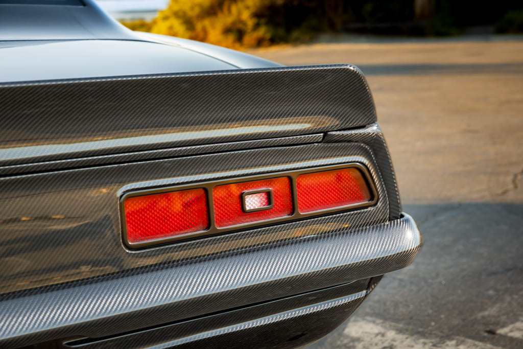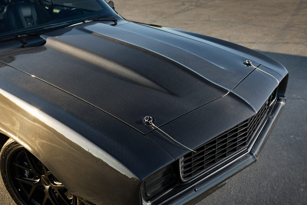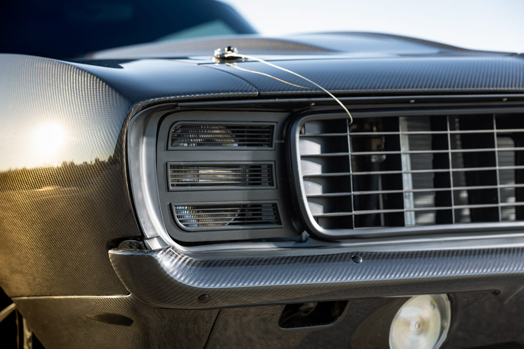 Brothers Composites of Sheboygan Falls, Wisconsin, was contracted to fulfill flawless carbon-fiber body panels for all of Finale’s project needs. The molds for these panels are pulled directly from factory ’69 Camaro parts, hence their true-to-form OEM shape and fitment. A common misconception about this Camaro’s finish is that the carbon finish is merely a wrap due to the perfection of the weave alignment. That myth couldn’t be more false. Custom billet/LED taillight housings were installed to update the car’s appearance with bright illumination and modern sequential signal functions. Flush-mounted glass gives the car a subtly smooth appearance, as does the billet door handles and mirrors.