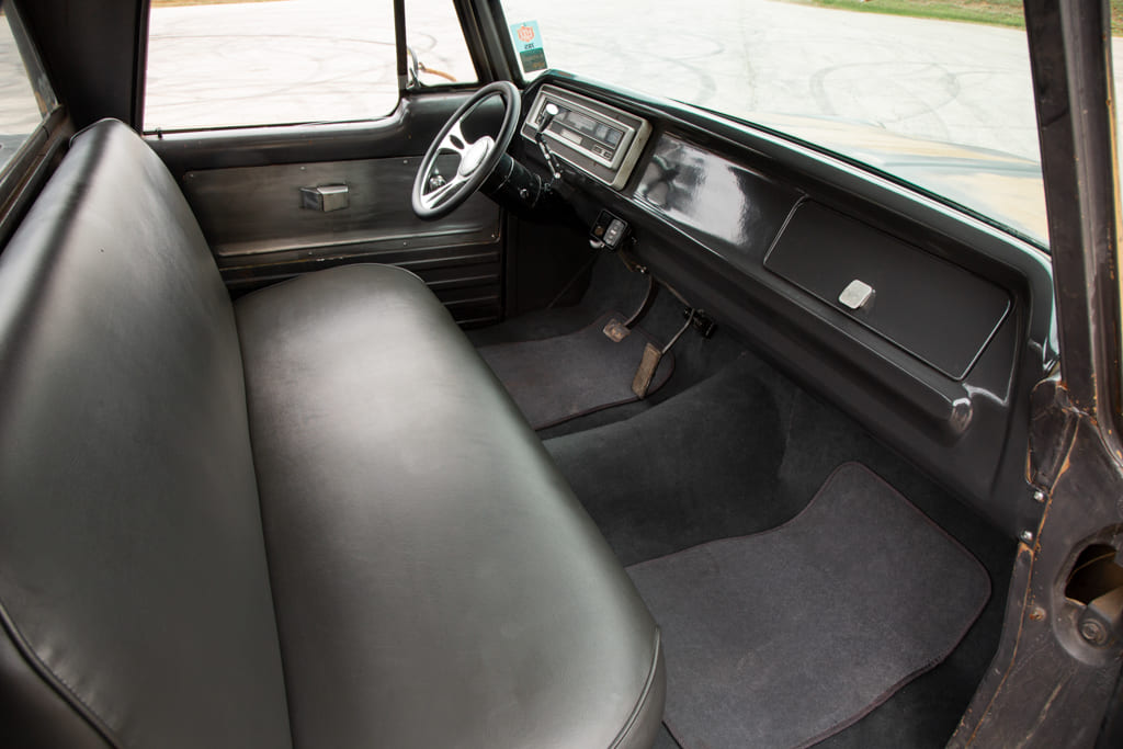 The interior, although simple, emanates a sense of cleanliness. Carl had EBT Upholstery cover the stock seat with premium vinyl, shaved and painted the dashboard, and made subtle adjustments to the door panels. While scrolling the Internet, he stumbled upon an appealing billet steering wheel that has just enough shine to dress up the inside of the cab. The interior, though currently modest, serves the purpose of functionality without distraction.