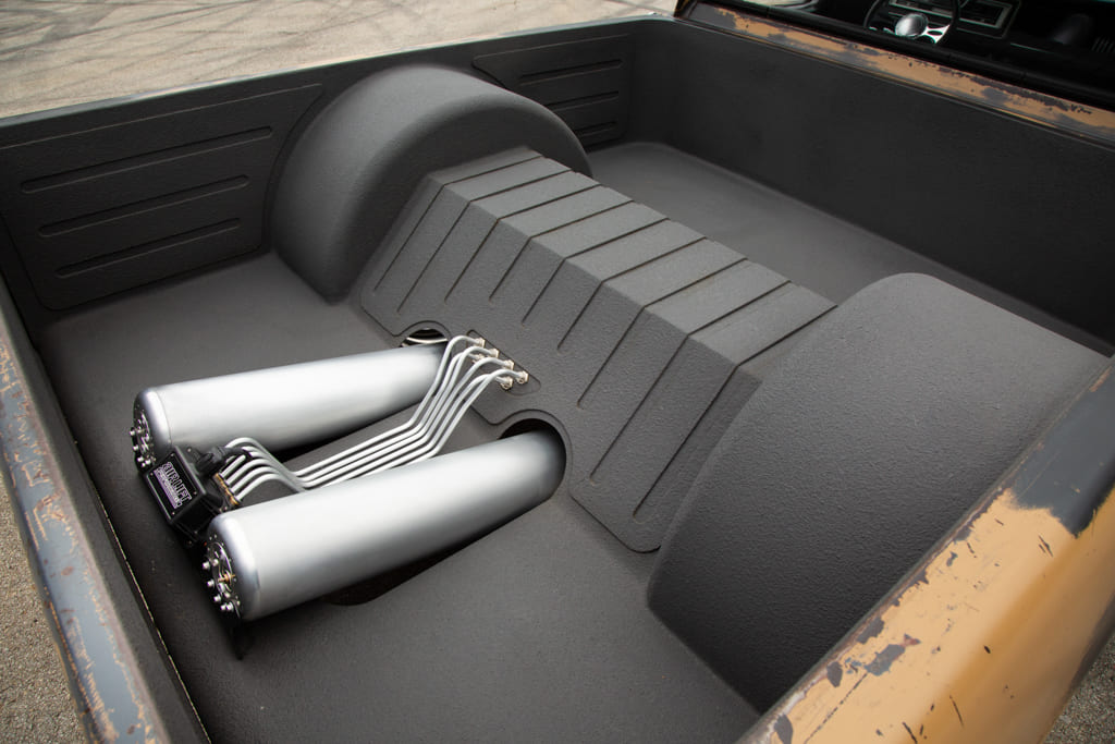 Speaking of the exterior, one cannot help but appreciate the distinct patina adorning the truck’s surface. Time has imparted a unique two-tone/leopard spot effect, merging tan and black hues. Carl adamantly believes that a fresh coat of paint would not enhance the truck’s already-distinctive charm. To safeguard his meticulous sheetmetal work in the bed and maintain cleanliness, he opted to have Hanners spray a custom bedliner, thereby showcasing his dual FLO air tanks and the Air Lift 3H system.
