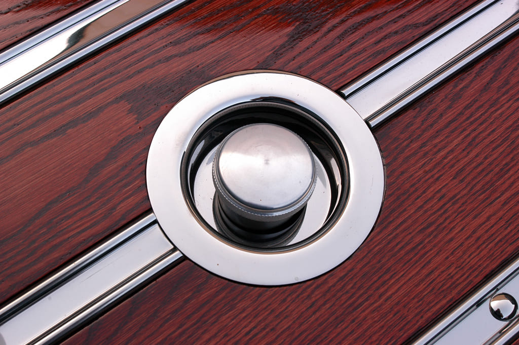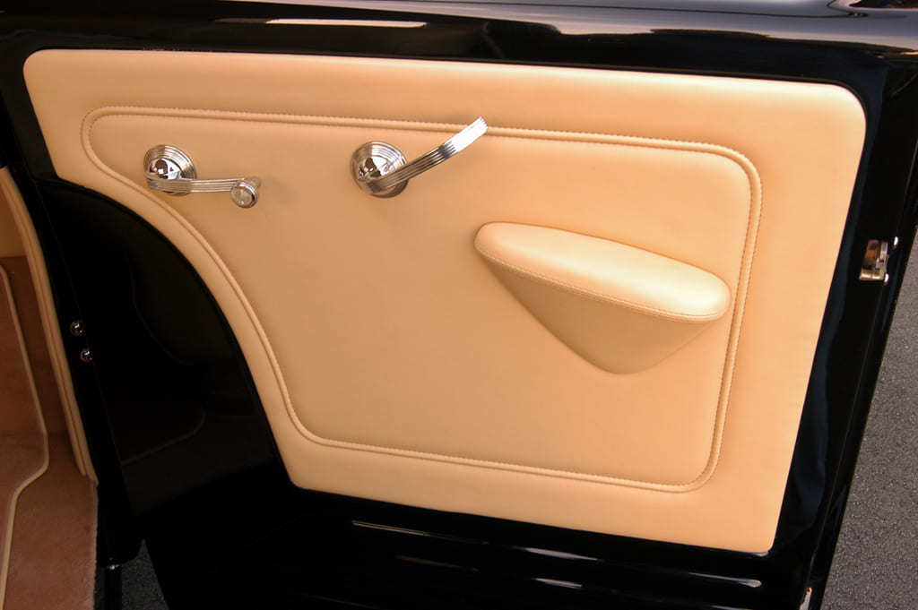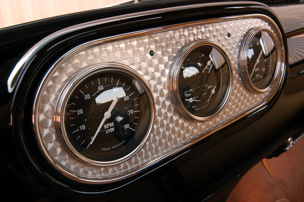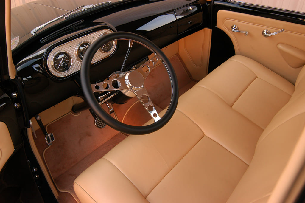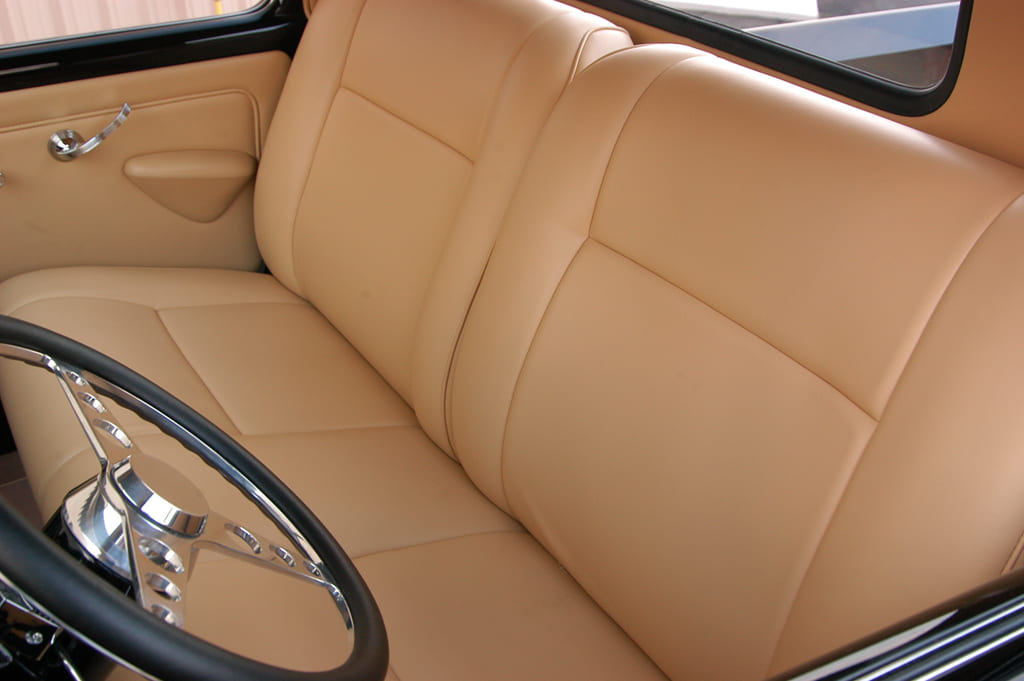 For the interior, Hot Rod Garage’s Dean Alexander handled the premium tan leather upholstery in-house, using a Glide Engineering bench, custom-made door panels, and complementing tan wool carpet in the process. To add that perfect hot rod finishing touch, a Flaming River column with a three-spoke Bell-style wheel and a trio of Classic Instruments Hot Rod Series gauges (of course!) in an engine-turned insert were added to the cab’s superclean, no-frills cab.