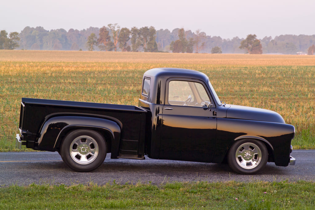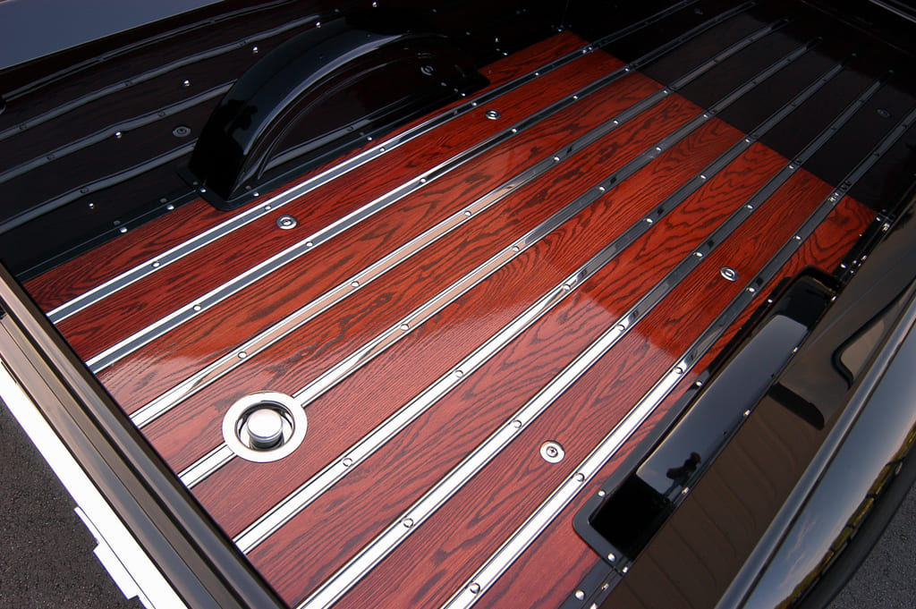 Externally speaking, Hot Rod Garage spent a good amount of time further perfecting the C-Series styling. Originally a five-widow 1/2-ton, Hot Rod Garage opted to increase Charles’ blind spots by filling the cab’s corner windows—a move with rather clean results—while at the same time replacing the stock driprails with hand-formed round rod. The once three-piece hood was made into a one-piecer that now opens in a traditional alligator fashion. Once the bed box was massaged smooth and fit with an oak bed floor. A ’56 F-100 rear bumper was added before the bodywork and PPG black paint were finished by Hot Rod Garage’s Jason Lester. A set of polished Billet Specialties Legacy wheels in 16- and 17-inch sit just right with that updated stance.