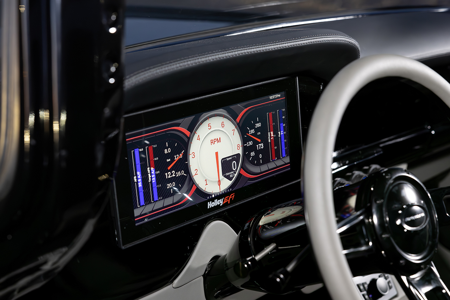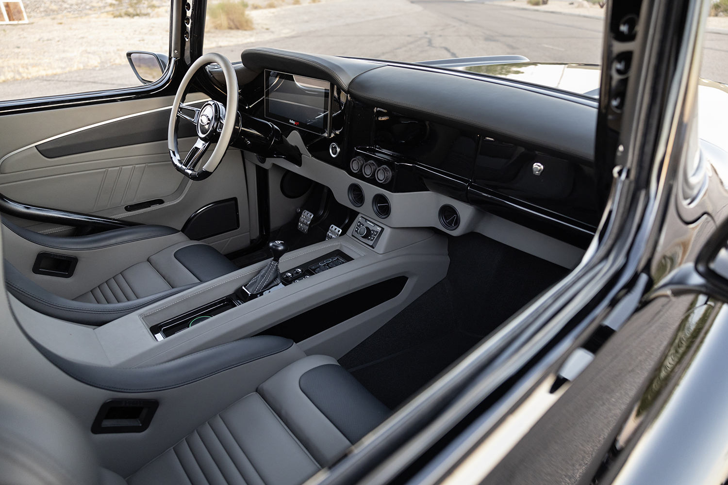 The next category that needed attention was the 3100’s interior space, which was already mapped out well in advance and was custom fabricated by Premier’s team. To kick off the in-cab construction, the expertise of Sew Cal Rods in Ontario, California, was sought out to upholster the pair of Sparco carbon-fiber race seats with custom leather hides. Matching door panels, center console, dashpad, and headliner were also stitched together to complete the look, which turned out to be a superbly modernized take on classic street rod cleanliness. A Holley EFI digital dash display was set into place to deliver an accurate in-depth peek at the truck’s vital signs. Keeping things cool (and warm when needed) is the ultra-compact Restomod Air Bantam-S climate-control kit, and conducting the tunes is a well-balanced collection of Rockford Fosgate hi-fi components. JT at Premier tackled the installation of American Autowire’s required harnesses to deliver the necessary juice throughout the 3100 from bumper to bumper.