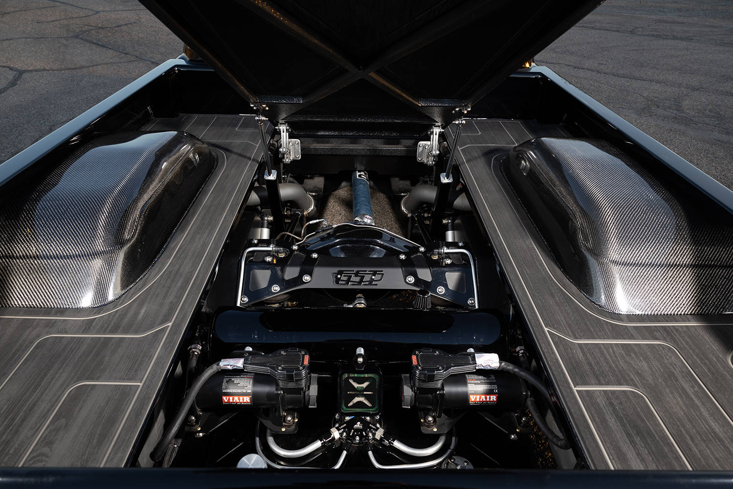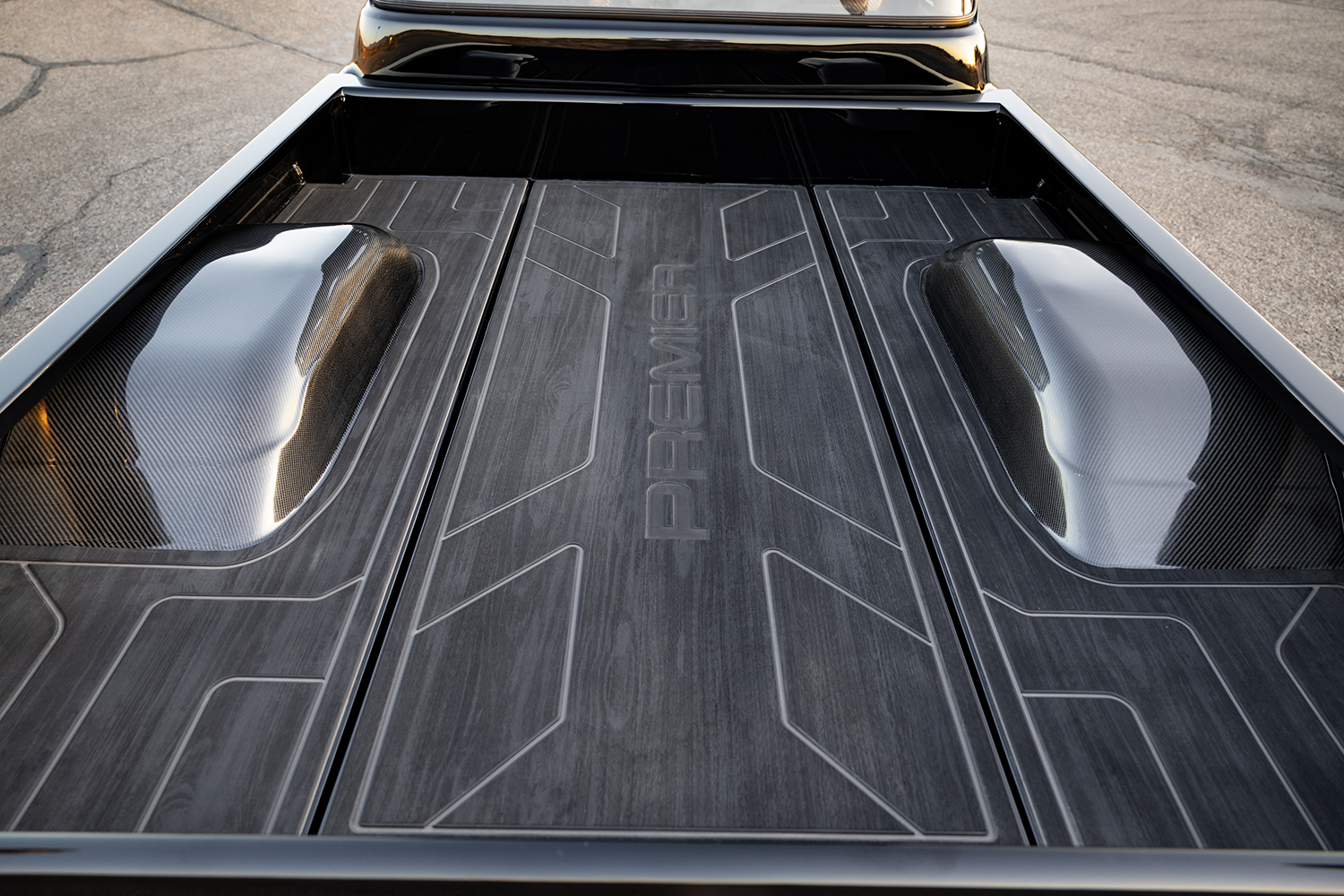 To complement the chosen color palette are carbon-fiber accessories from Munssey Speed, including custom rear diffuser sections, covers for the Ringbrothers mirrors, a grille shell, and surrounds that complement the Lokar door handles and Nova-Lux LED headlights. The Hart Fab front steel inner fenders and carbon-fiber rear fenders help round out the truck’s subtle restyling. Fresh panes from Lucky’s Auto Glass were soon added to allow a clear view in every direction. Dek X marine flooring was then utilized for the custom raised bed floor that emits a truly unique look, as does the actuating center panel that lifts for direct access to the suspension system below.