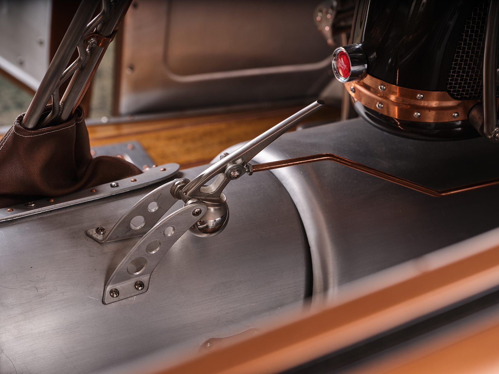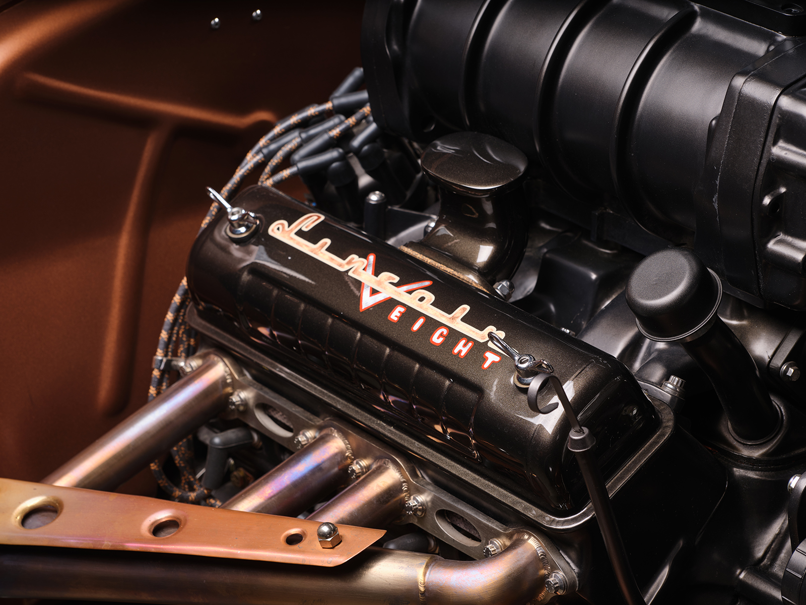 The ignition is a PerTronix Flame-Thrower with vintage (cloth) plug wires. The valve covers are factory Y-block but were lettered by Bill to give the illusion of Lincoln V-8 rocker covers. The exhaust is based on 1-3/8-inch stainless steel tubing that is fabricated into a “fan” shape with an external copper heatshield bolted to the open headers.
