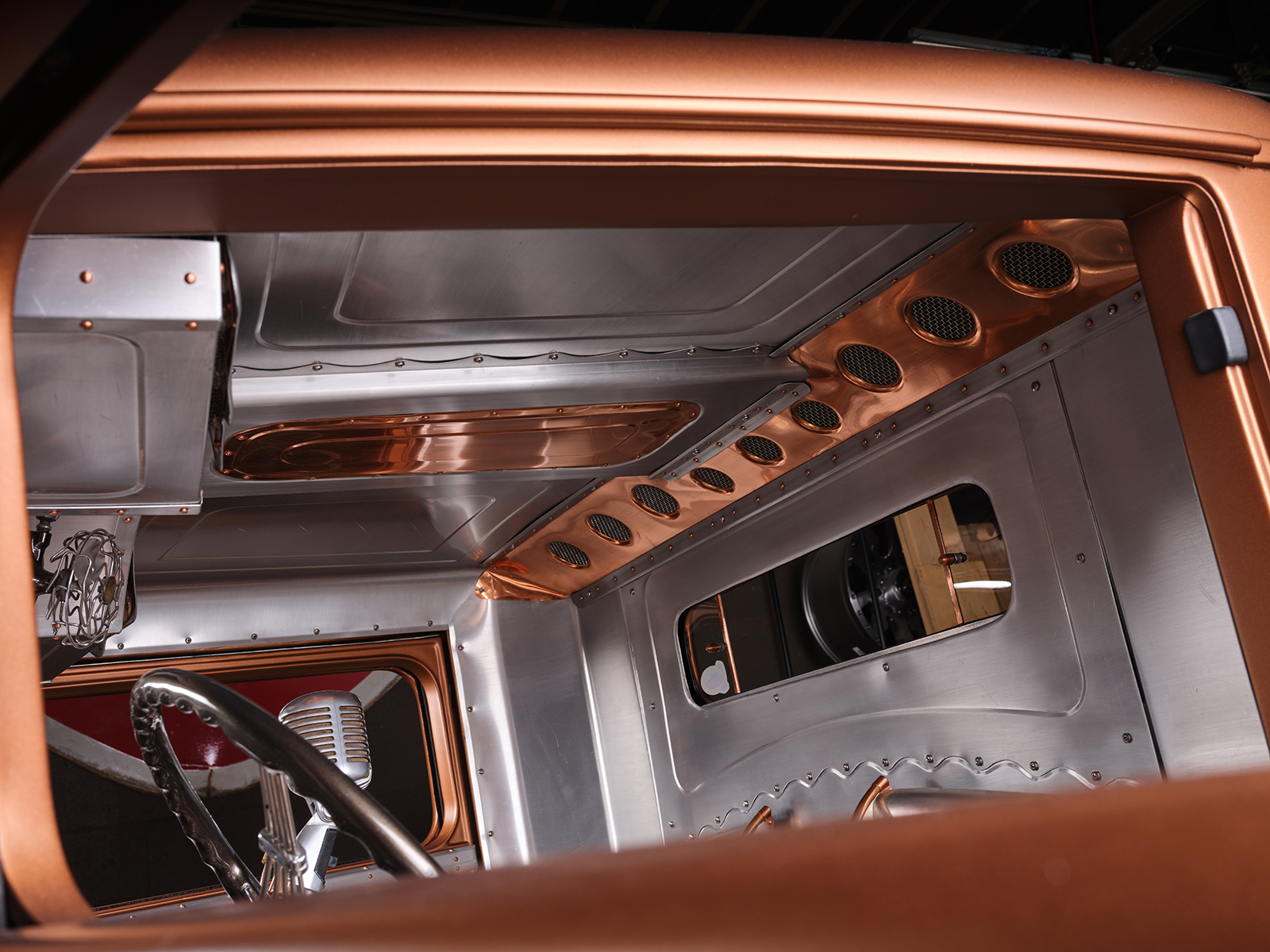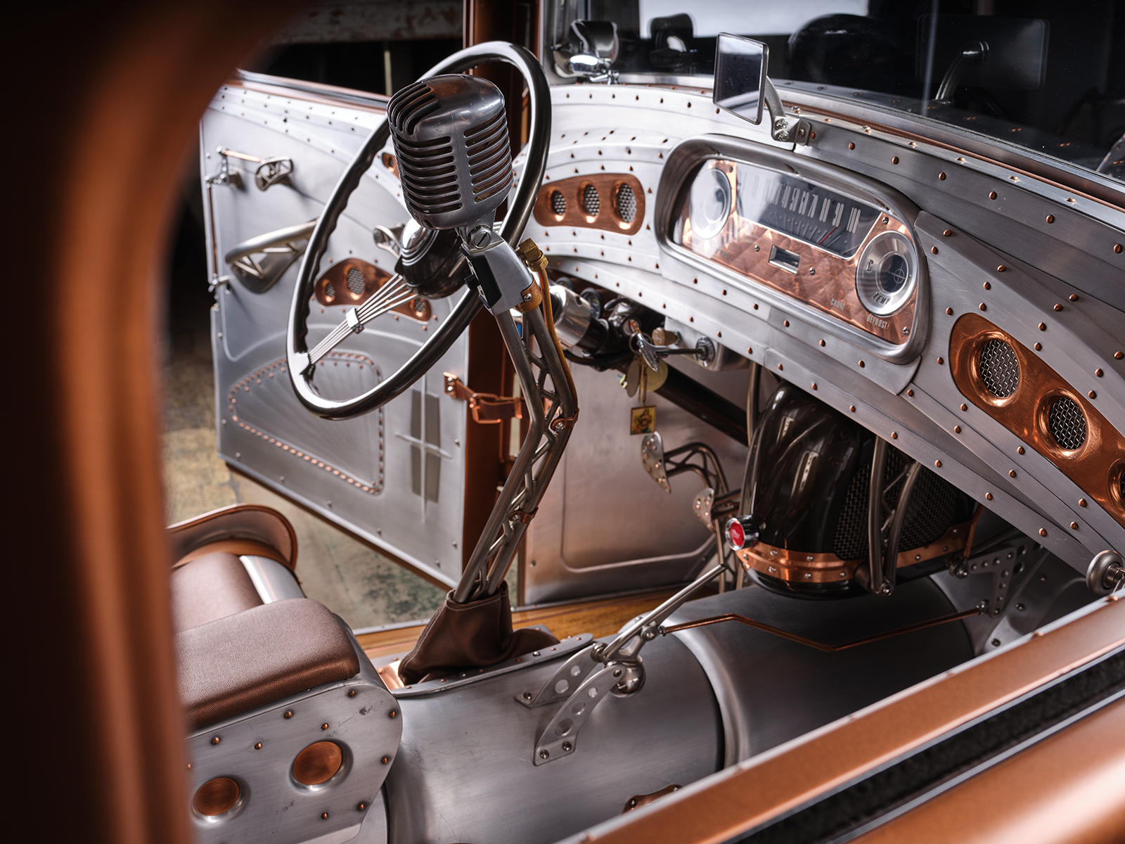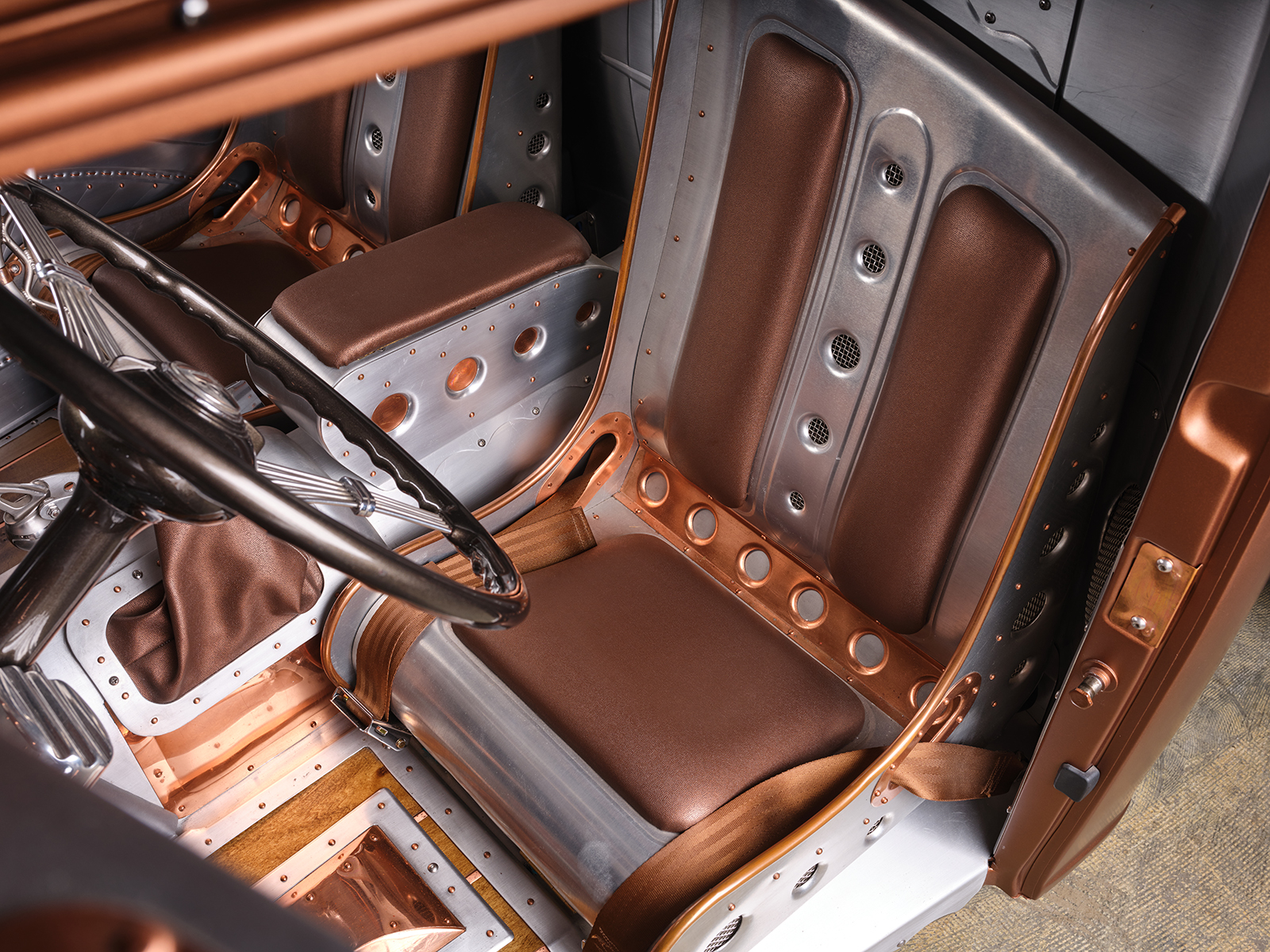 Inside there is the distinctive ’62 Ford Falcon instrument cluster with stock gauges built into the fabricated aluminum dash accented with copper rivets. Bringing the gauges to life, as well as all the other electrical components, is the American Autowire kit wired by Todd Burks. Hanging from the handmade dash is a ’39 Ford steering column and “banjo” wheel.