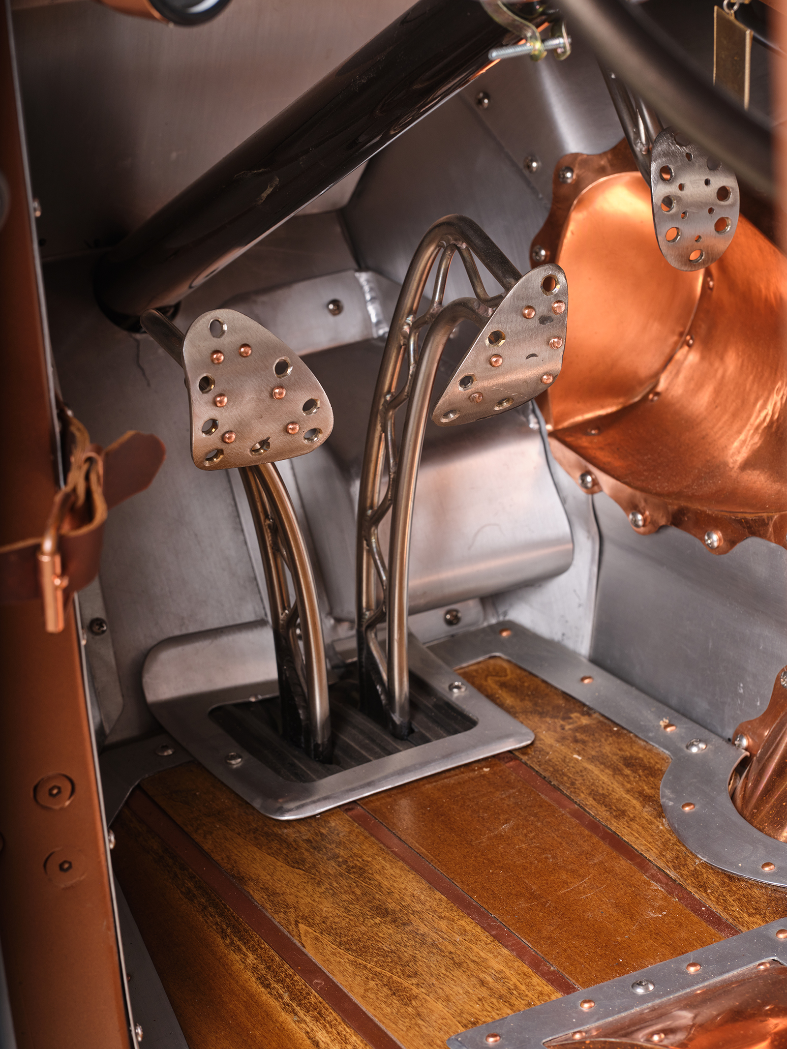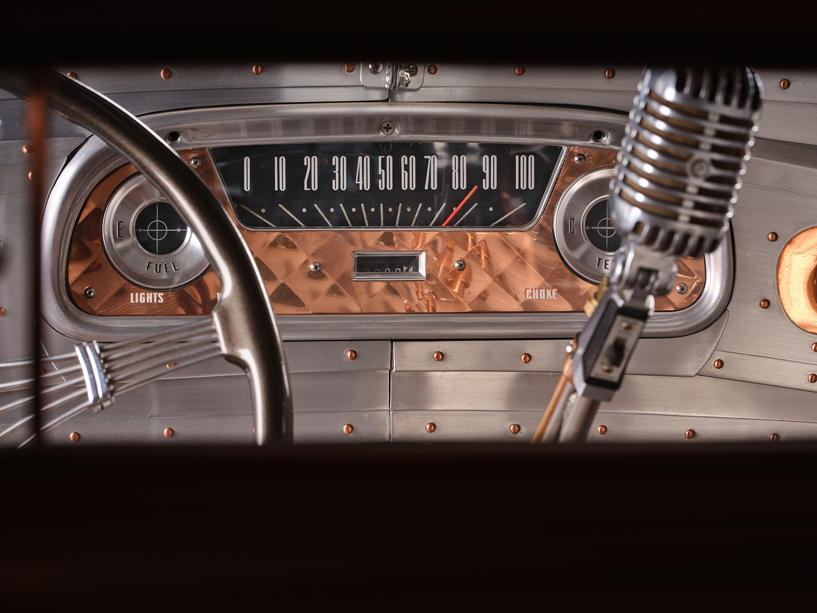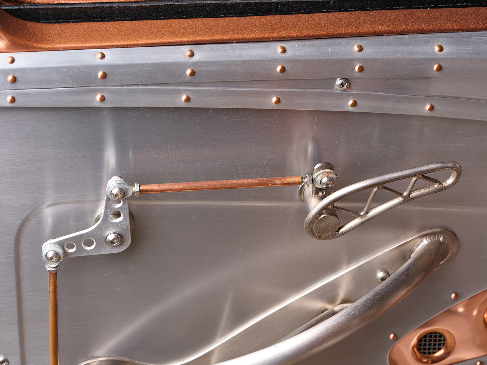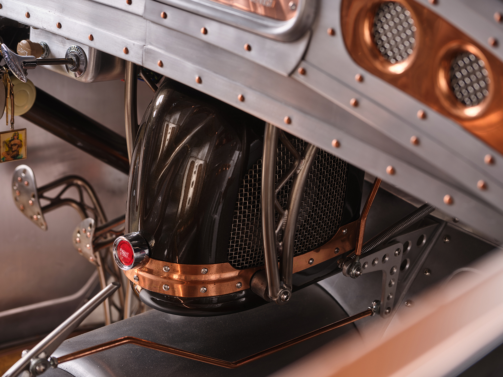 Inside there is the distinctive ’62 Ford Falcon instrument cluster with stock gauges built into the fabricated aluminum dash accented with copper rivets. Bringing the gauges to life, as well as all the other electrical components, is the American Autowire kit wired by Todd Burks. Hanging from the handmade dash is a ’39 Ford steering column and “banjo” wheel.