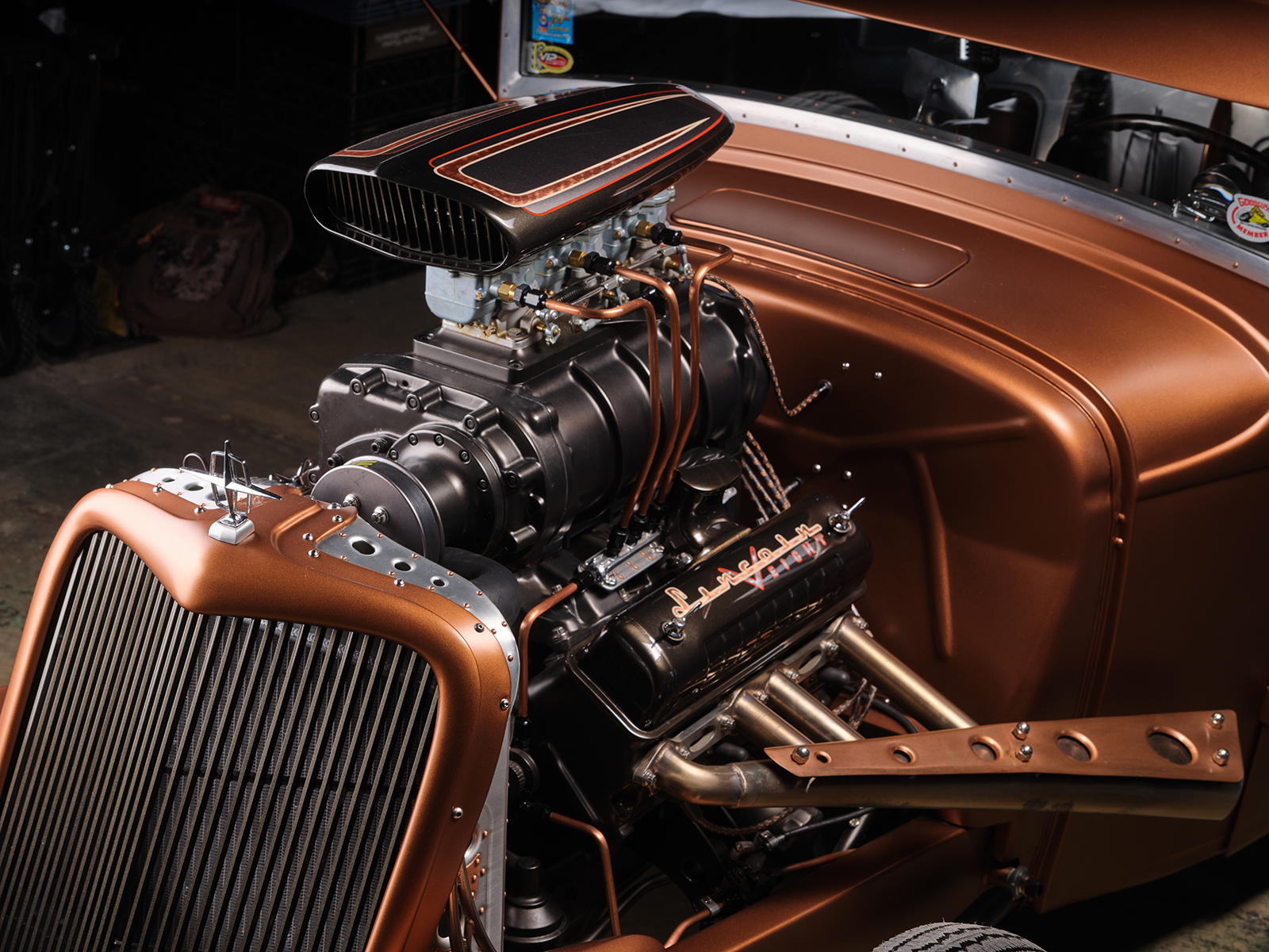 The rear suspension is based on a Ford 9-inch rearend and axles with 4:10 Richmond ring-and-pinion gears and drum brakes. There is a triangulated four-link setup along with QA1 coilover shocks. The wheels and tires are a combination of ’32 Ford 18-inch-diameter wires in front and ’35 Ford 16-inch wires in back. To this, Coker Excelsior rubber is added with 4.50 in front and Coker Firestone Deluxe 7.50 in the rear.