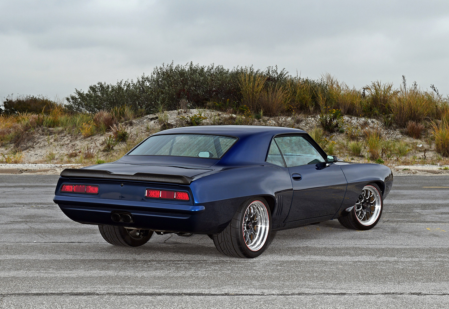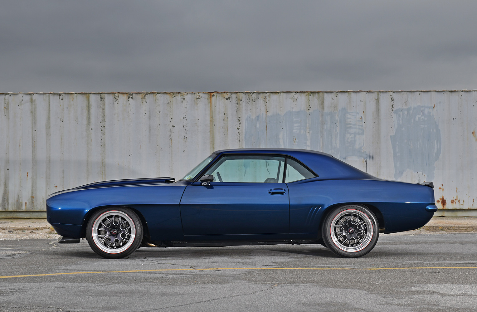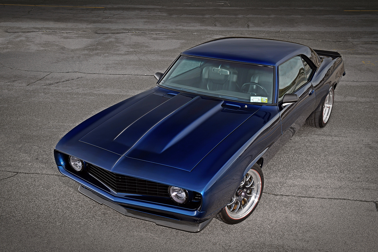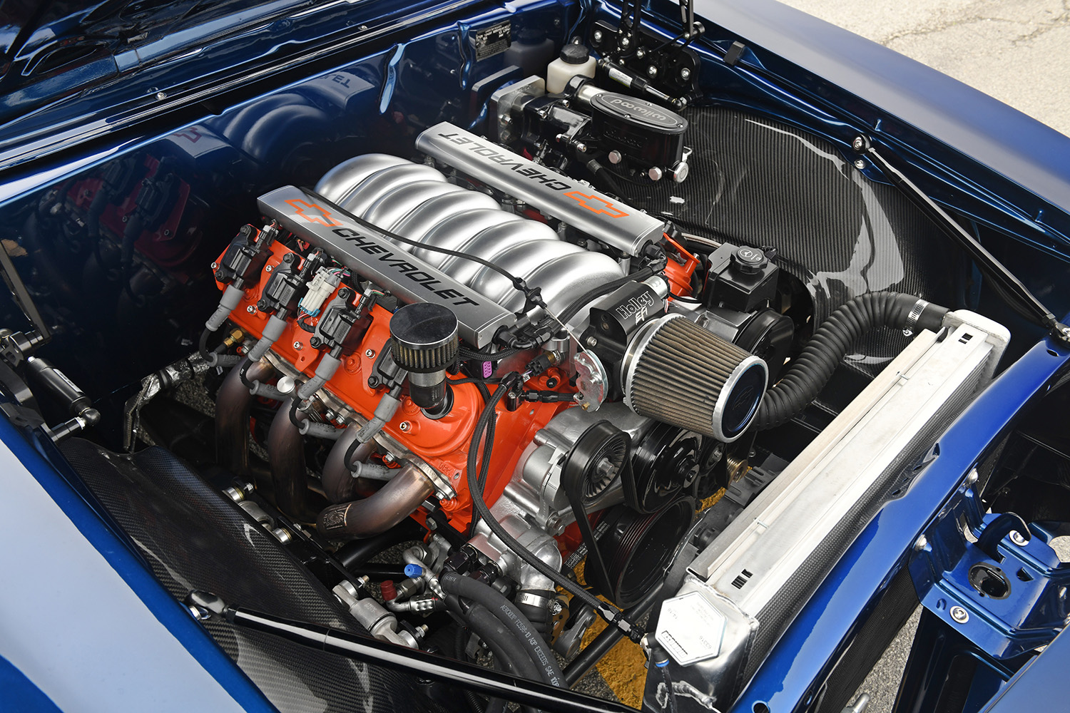 The firewall was smoothed to create a fetching place for the future powerplant; mini-tubs were installed out back to accommodate the massive wheel-and-tire combo. Other custom add-ons include carbon-fiber fenderwells, a carbon-fiber front valance, and a rear spoiler to give the Camaro that all-important Pro Touring look. Once the car was laser straight, BonaFide sprayed on a layer of Axalta Midnight Blue to the Camaro’s flanks. Flight Line Aircraft Detailing in Teterboro, New Jersey, finished off by treating the body with P&S Ceramic Coating materials.