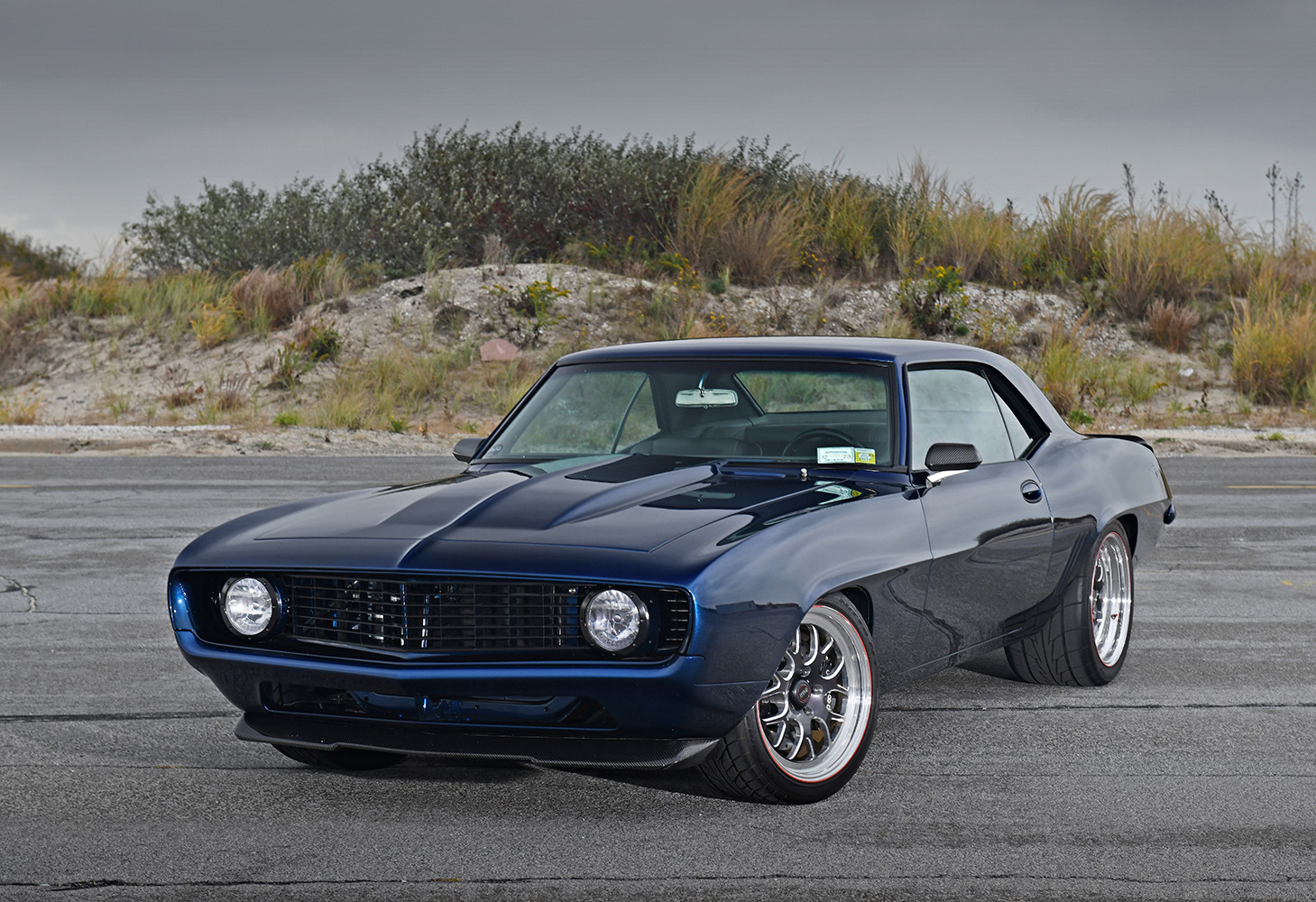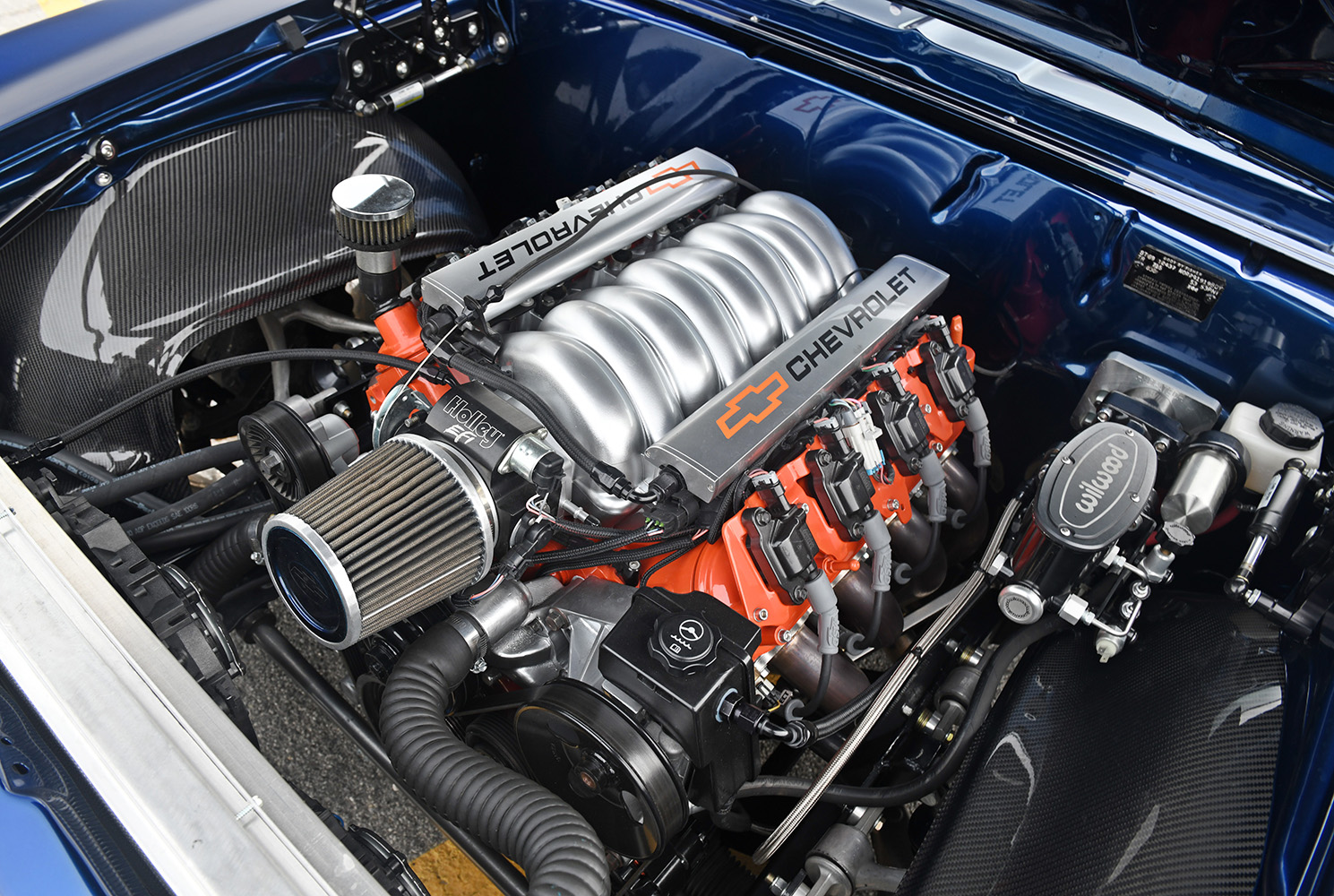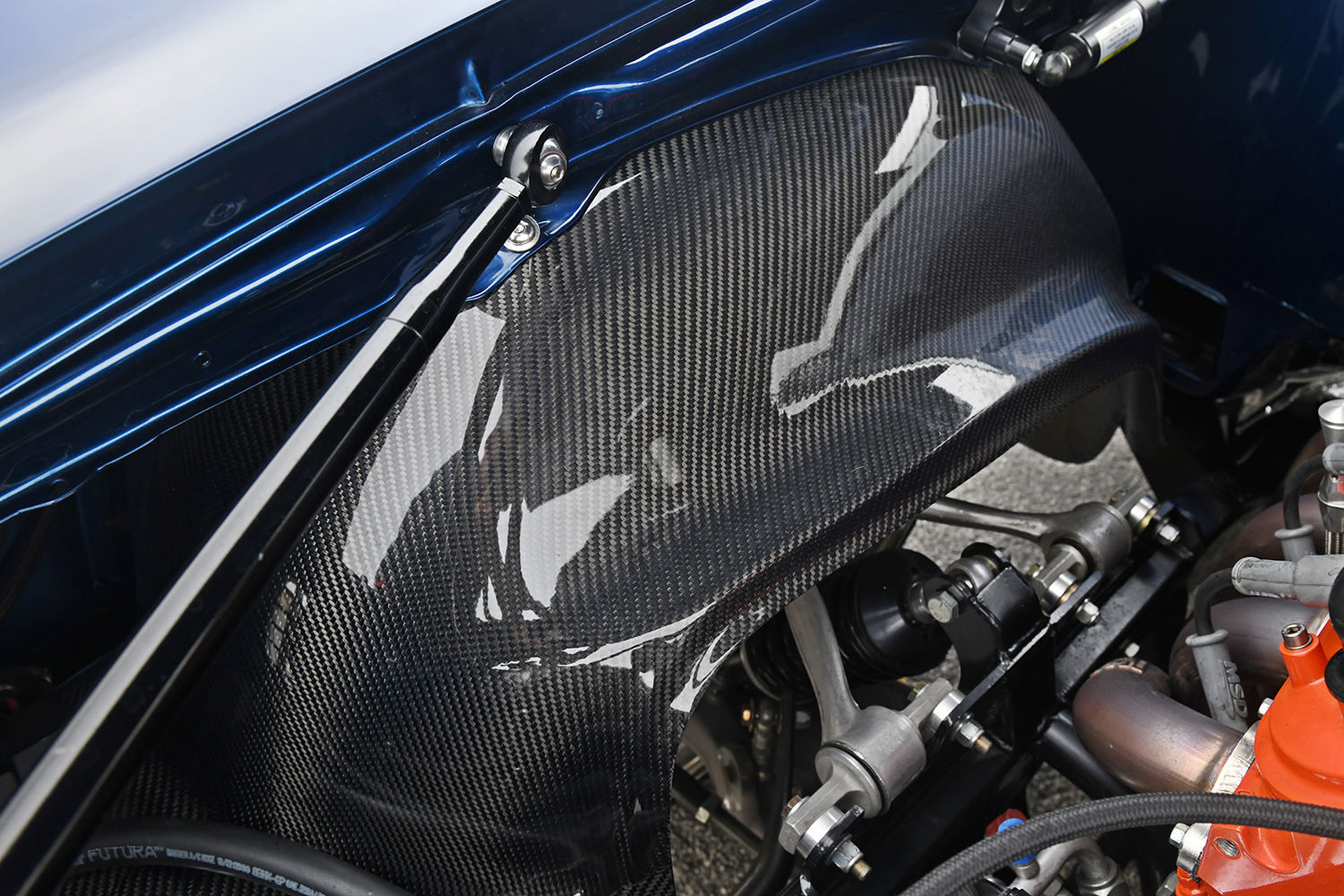 The firewall was smoothed to create a fetching place for the future powerplant; mini-tubs were installed out back to accommodate the massive wheel-and-tire combo. Other custom add-ons include carbon-fiber fenderwells, a carbon-fiber front valance, and a rear spoiler to give the Camaro that all-important Pro Touring look. Once the car was laser straight, BonaFide sprayed on a layer of Axalta Midnight Blue to the Camaro’s flanks. Flight Line Aircraft Detailing in Teterboro, New Jersey, finished off by treating the body with P&S Ceramic Coating materials.