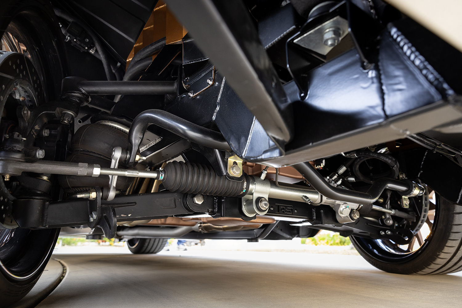 To maximize performance and simplify the installation, Burman opted for GM’s Connect and Cruise system. This seamless package paired a potent 2021 LS3 6.2L engine with a reliable 4L60-E transmission, ensuring optimal compatibility and ease of installation. To further enhance the engine’s performance, the team added a PRC aluminum radiator, Billet Specialties’ Tru Trac serpentine system and valve covers, Ultimate Headers, and a custom exhaust system topped with Flowmaster 40-Series mufflers. The transmission was also paired with a C5 Corvette shifter promising an exhilarating driving experience. While the upgraded components significantly boosted the engine’s power, the true artistry lay in the custom metalwork performed by the Lakeside team within the engine bay.