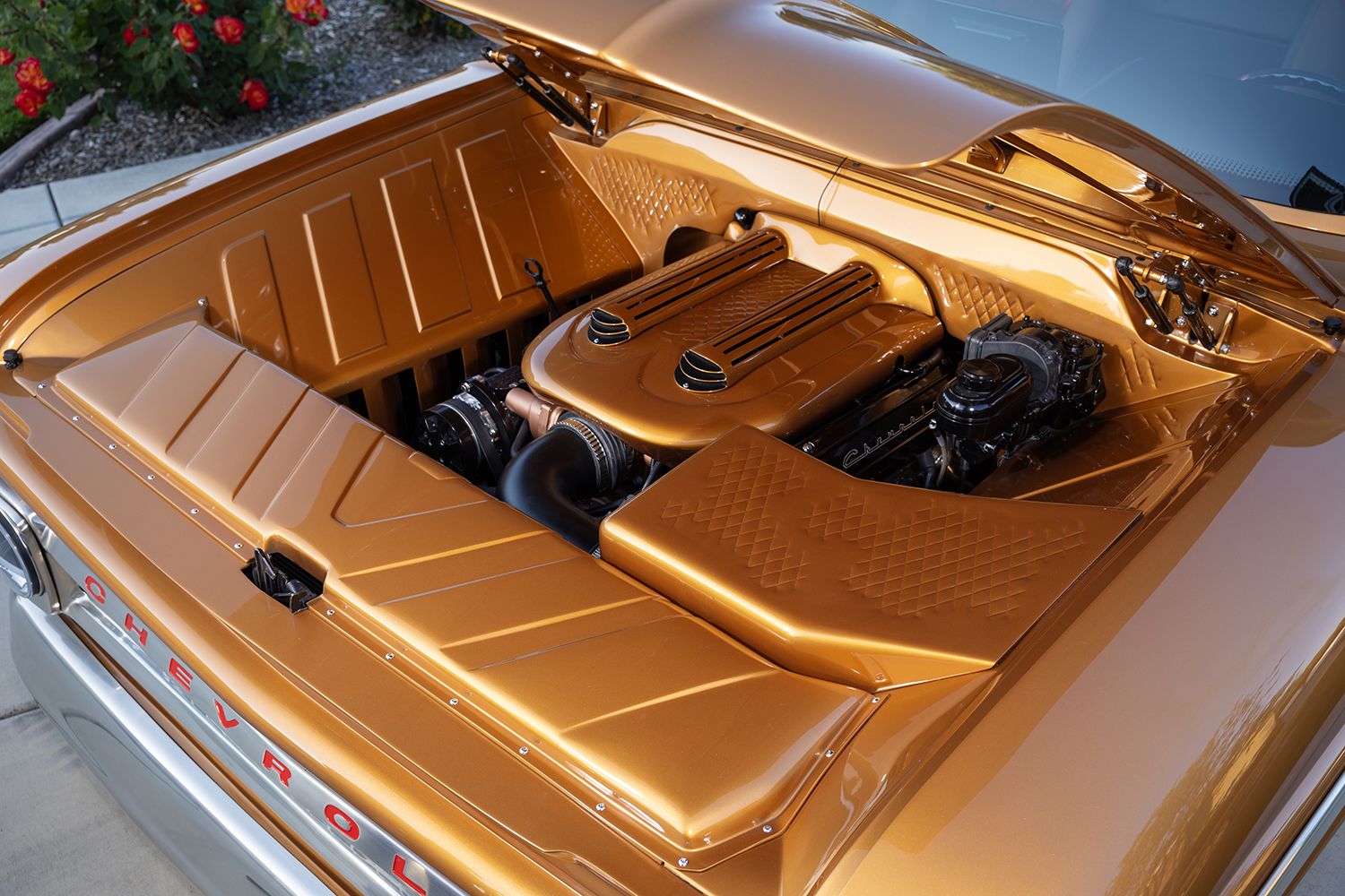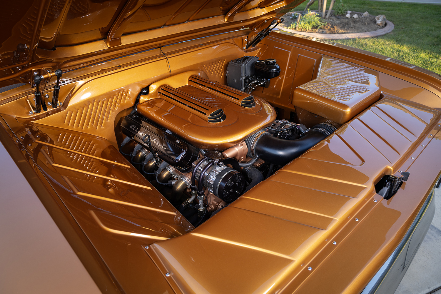 10 1966 Chevrolet C10 copper engine bay featuring Chevy engine polished components high performance build