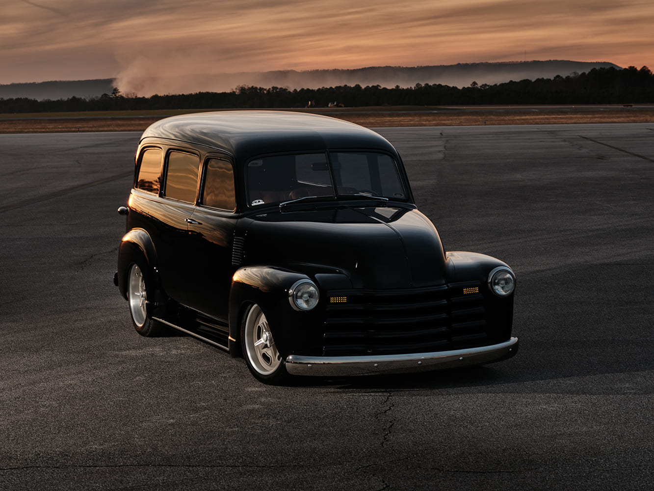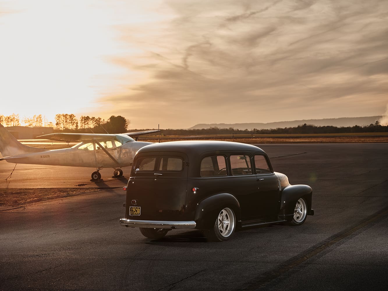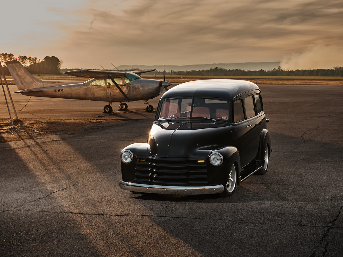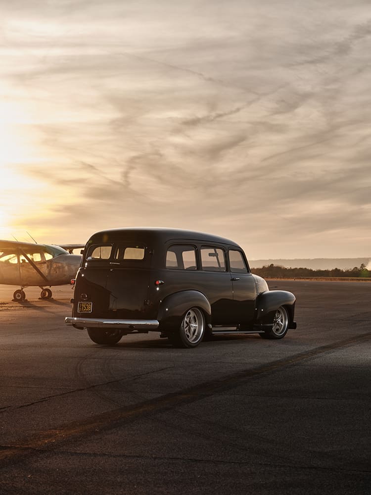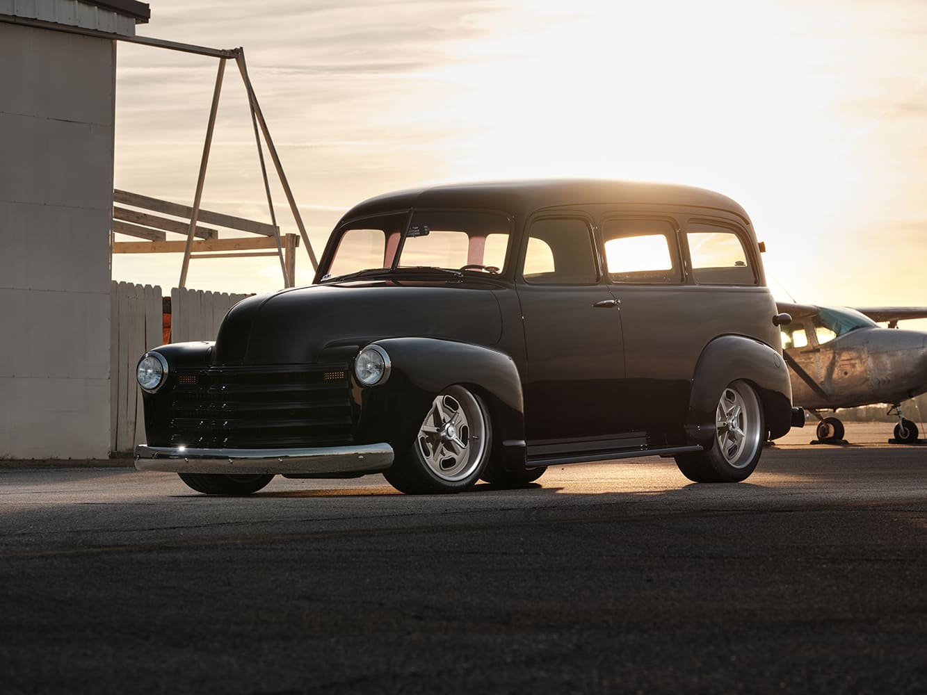 03 1952 Chevy Suburban black low front passenger view modern wheels hangar and fence