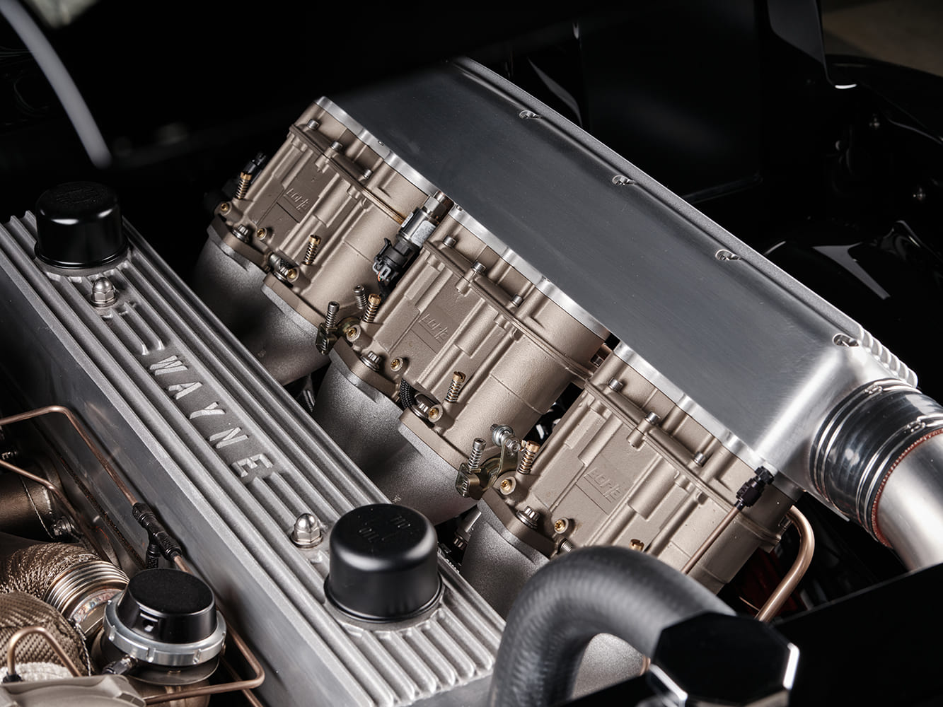 Paying homage to David’s landspeed “hobby,” Johnson procured a 1958 Chevy 261 (the brute of the Stovebolt family) and sent to famed engine builder Keith Dorton at Automotive Specialists for a proper high-horse build. As you can see from the pics, the now 265ci/540hp inline-six features not one but two Garrett Gen II GTX turbos on the LS-style (coil-on-plug) ignition side, while the driver side features a JHRS designed and fabbed aluminum intake with three Borla Weber IDA-style throttle bodies and a brilliant finned rocker cover inspired airbox to match the twin-turbo setup (all controlled by Holley’s Terminator X-Max). Custom cast-stainless exhaust manifolds mount below the turbos on a Wayne aluminum cylinder head and feed a custom stainless exhaust with Borla mufflers, while a Quick Time fabricated-steel SBC bellhousing with a custom-made adapter plate attaches a Bowler T-56 Magnum that feeds the horses and the 582 lb-ft of torque to a Moser 12-bolt rear. For someone like myself who’s always been a fan of the ’50s inliners, this one is pure eye candy—and it definitely delivers the groceries!