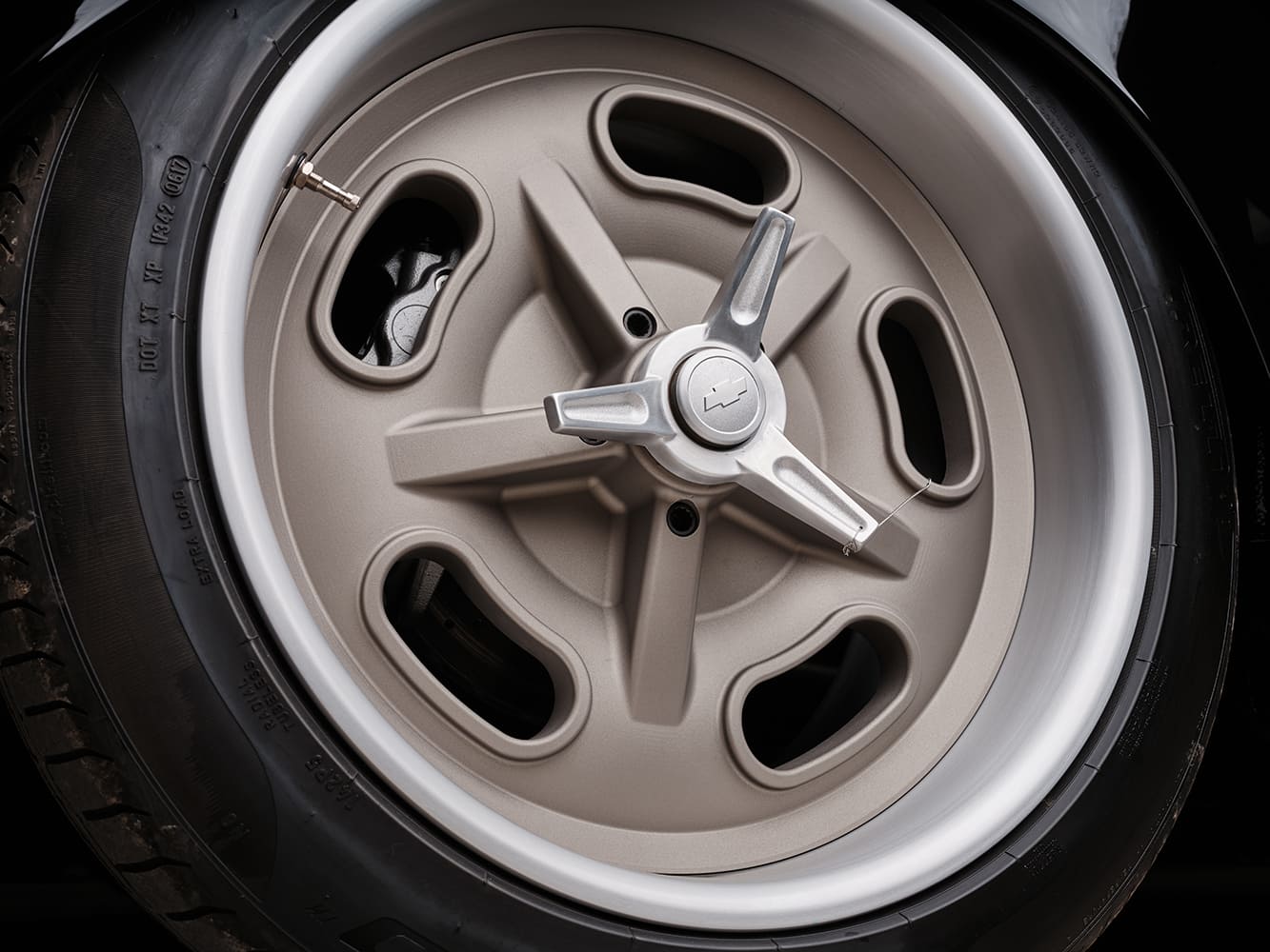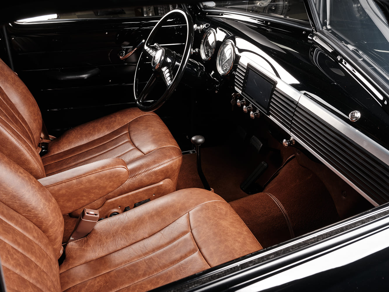 14 1952 Chevy Suburban cockpit tan seats black Chevy steering wheel round gauges retro dash knobs