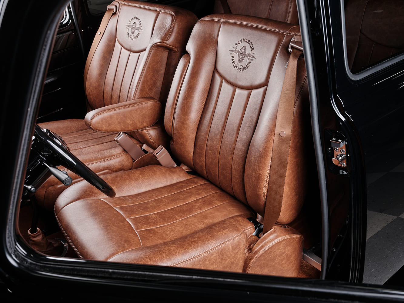 Johnson’s team of Jon Barefoot, John Fischer, and Maria Garcia handle the metalwork inside and out (on the interior, it’s all metal—no upholstered panels!), while Greg Chalcraft and Scott Falotico expertly took care of the Axalta black paintwork. The upholstery that can be found on the 2005 Tahoe cut-down buckets is Garrett distressed leather by Marcia Garcia, with gorgeous Sapele hardwood flooring in the rear. Once wired with an American Autowire harness, the Suburban was fit with a Kicker sound system, Classic Instruments gauges, and a Vintage Air A/C system. Oh, and that steering wheel is stock. It’s simply been cut down to a 16-inch diameter, refinished, and mated to an Ididit column!