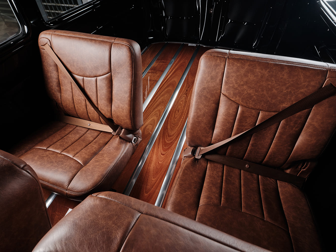 18 1952 Chevy Suburban cargo area wood plank floor polished metal strips seatbacks glossy black wheel well