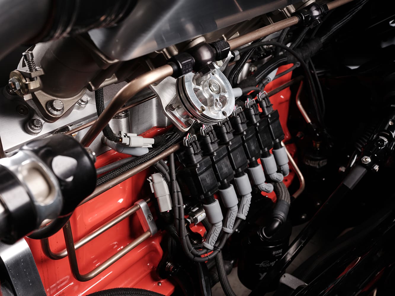 12 1952 Chevy Suburban engine detail red block fuel injectors wiring polished rail braided lines