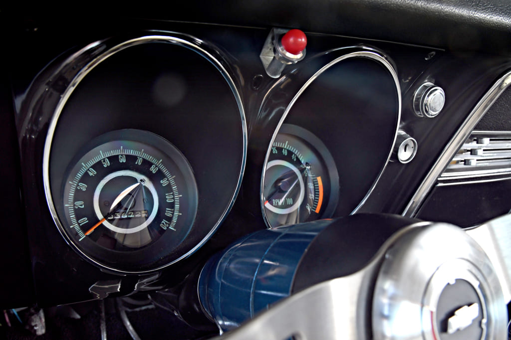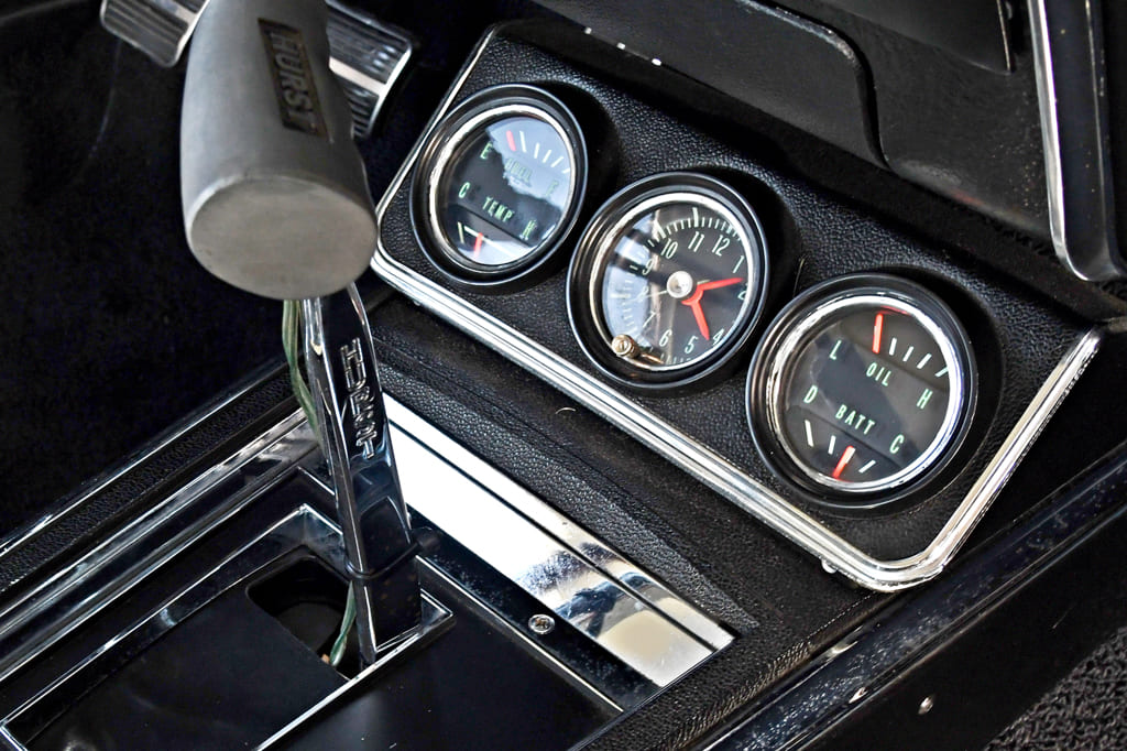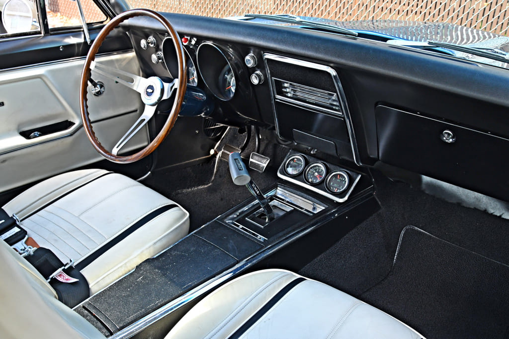 The interior is all old-school cool and is close to the way it came from the factory. First, the Deluxe interior upholstery was done over in its original white vinyl. To keep this ride pointed in the right direction, a deluxe walnut wood steering wheel rests on the original steering column. A Hurst T-handle shifter is mounted in the car’s born-with console and shifts the Muncie M21. Fresh carpet and a restored dash and gauges finish off the cockpit.
