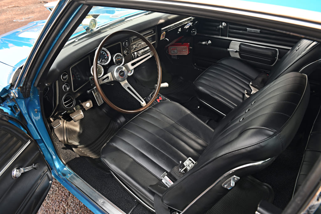 Mark liked the color the Chevelle came with and realized the paintjob was worth saving. He also found that most of the skin was in great shape even with a few battle cars from its racing days. He blended in some new LeMans Blue on the flanks to give the Chevelle’s exterior a freshening up then replaced the damaged trim bits and added a pair of new chrome bumpers fore and aft.