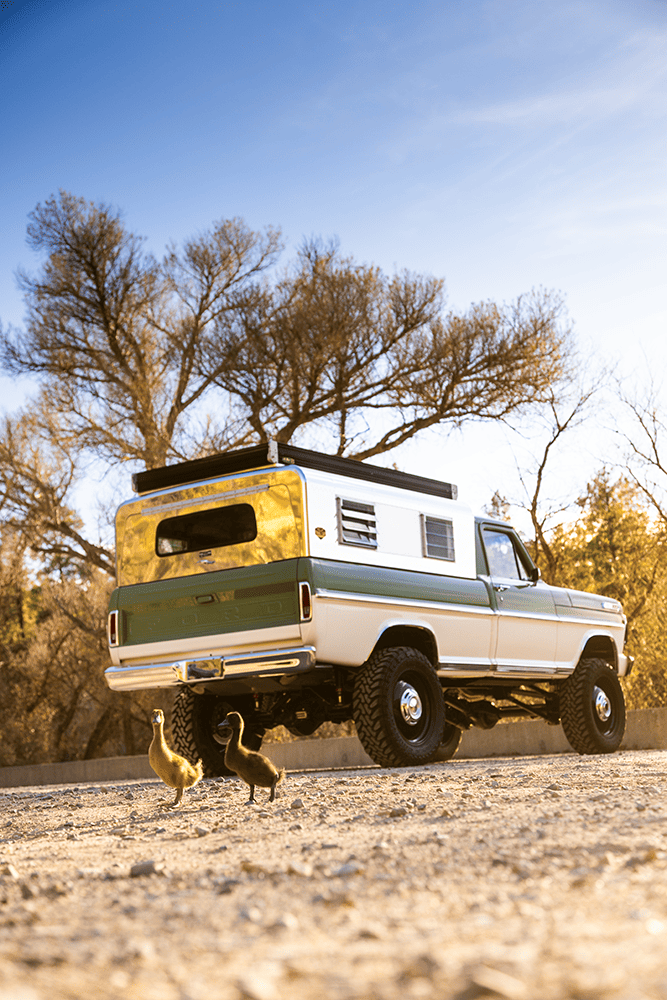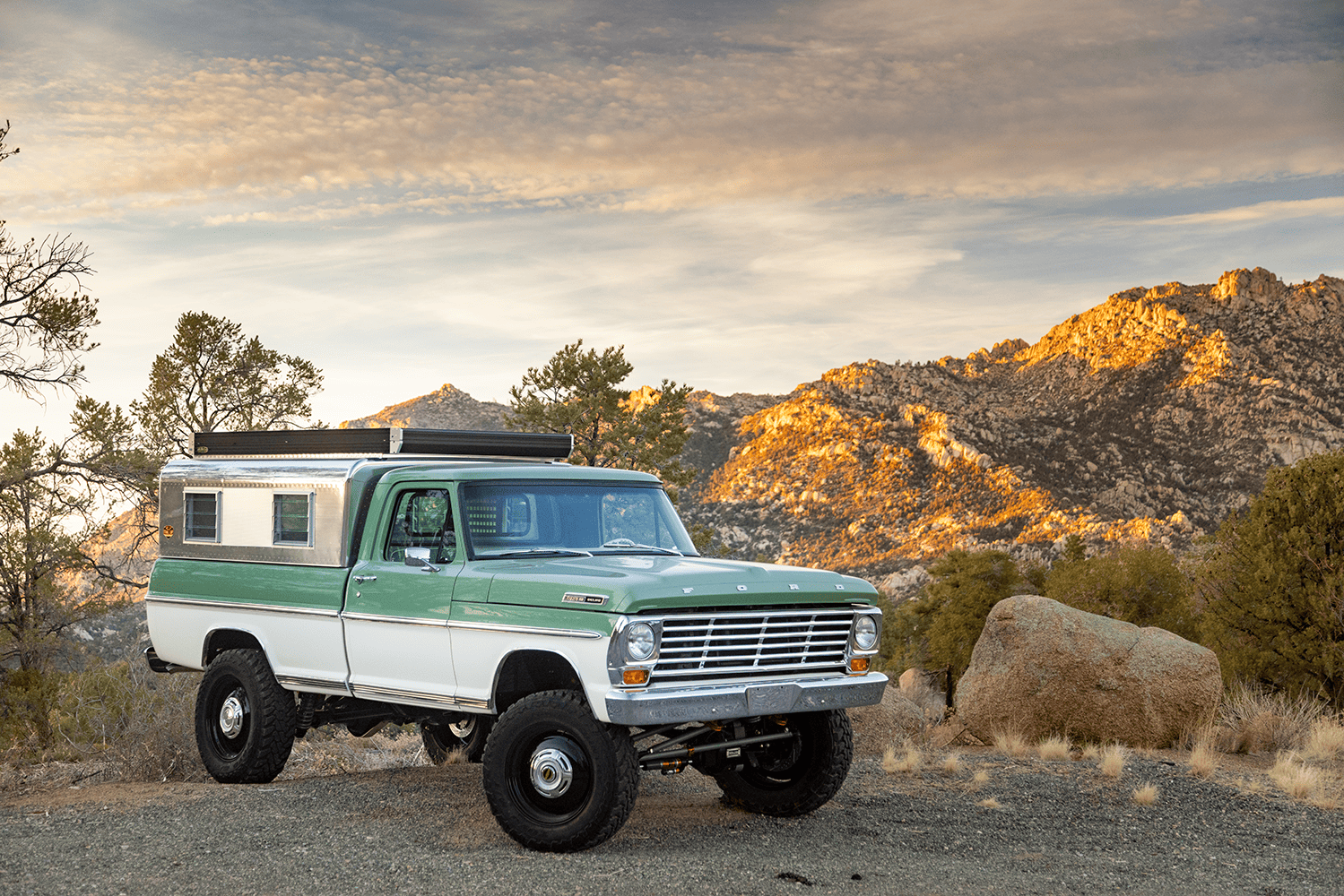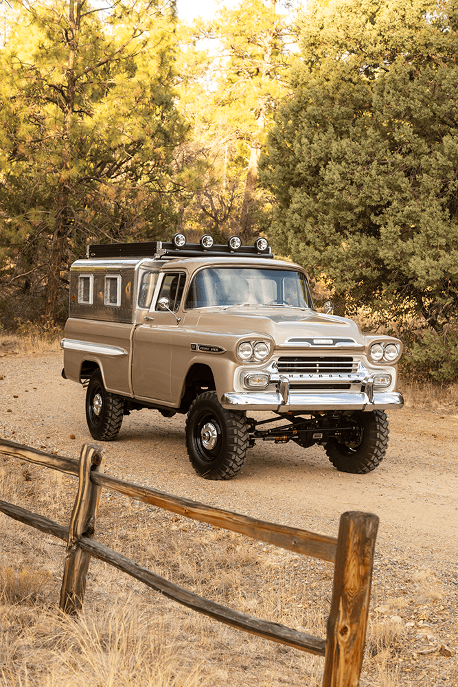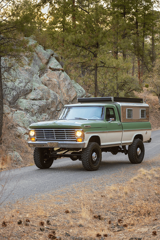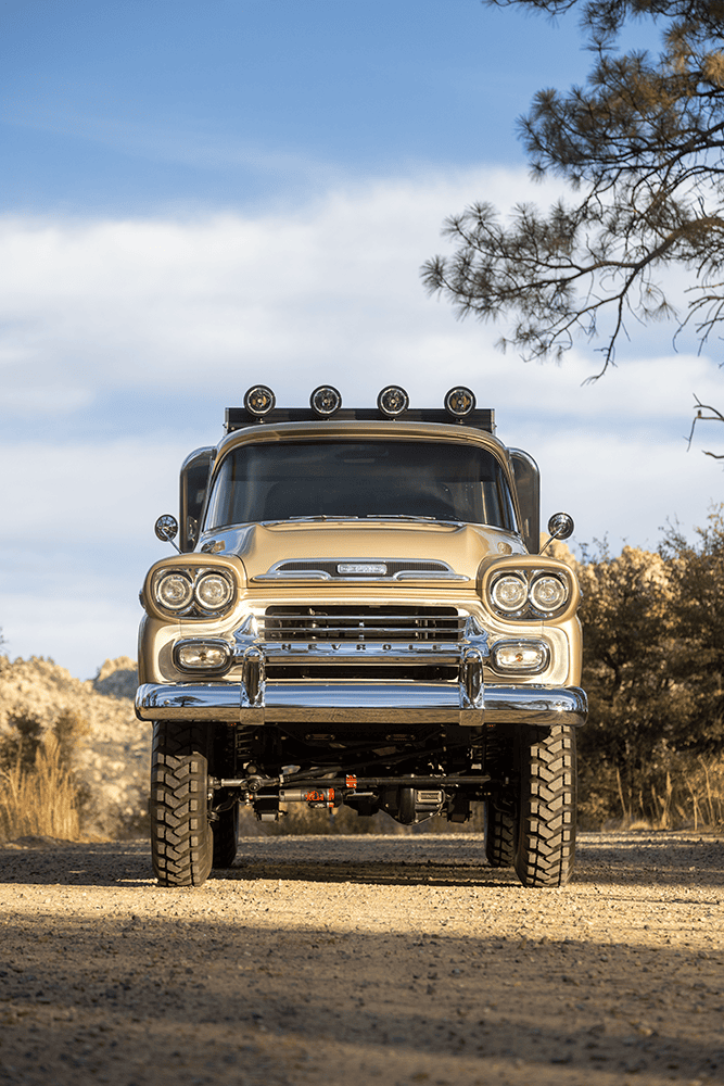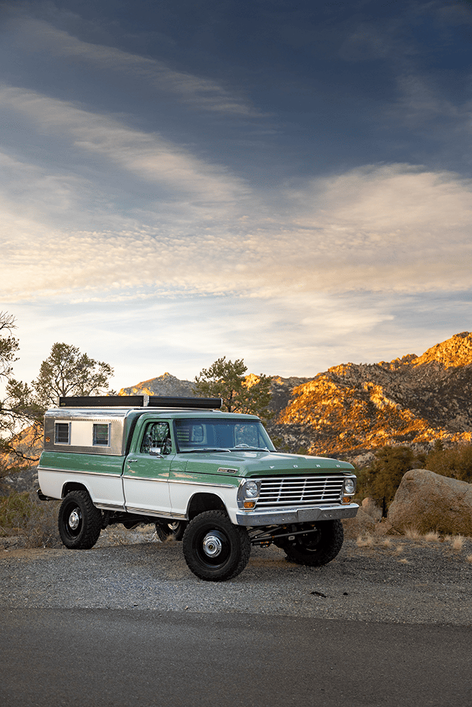 In case you were wondering about specifics, both the Apache and the Bumpside ride on custom “mid-length” (one of Del’s signature styling cues for the off-road design) Roadster Shop RS4 chassis with back-dated, Holley-fed LS3s—the Chevy using Delmo Speed adapters for a 283 inspiration while the Ford uses Delmo Speed adapters to achieve a 351W presence—and Hughes 4L80s with Atlas transfer cases and Dana 60/44 differentals. Wheels are custom steelie-look billets milled by Leading Edge Machine and Design (who also whittled the bitchin steering wheels in both trucks!) with Toyo Open Country 275/65s and Delmo-edition Baer disc brakes. Lewis Millinich handled the ’63 Corvette gold on the Apache, which is complemented by a retro Trail Cap aluminum camper shell; he refinished Eckberg’s F-250 in Boxwood Green and Wimbledon White two-tone, which is also outlandered-out with a Trail Cap rig. Also (now) local to Prescott, my good old friend from Austin via L.A. (or vice-versa), Sean “Fat Lucky” Johnstun crafted the beautiful interiors in both, which also feature Dakota Digital instrumentation, Vintage Air, and custom sound systems utilizing rearview mirror backup cams.