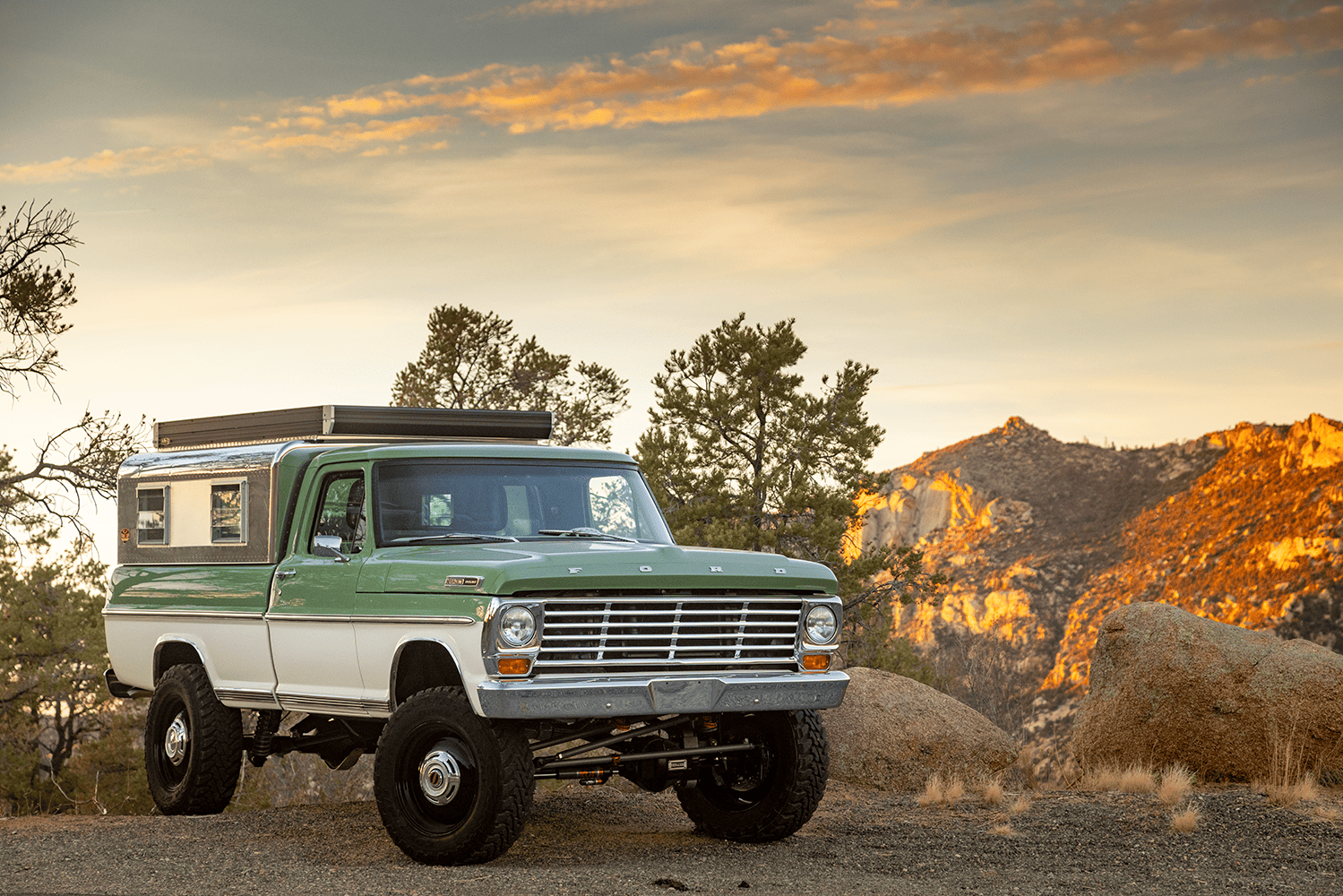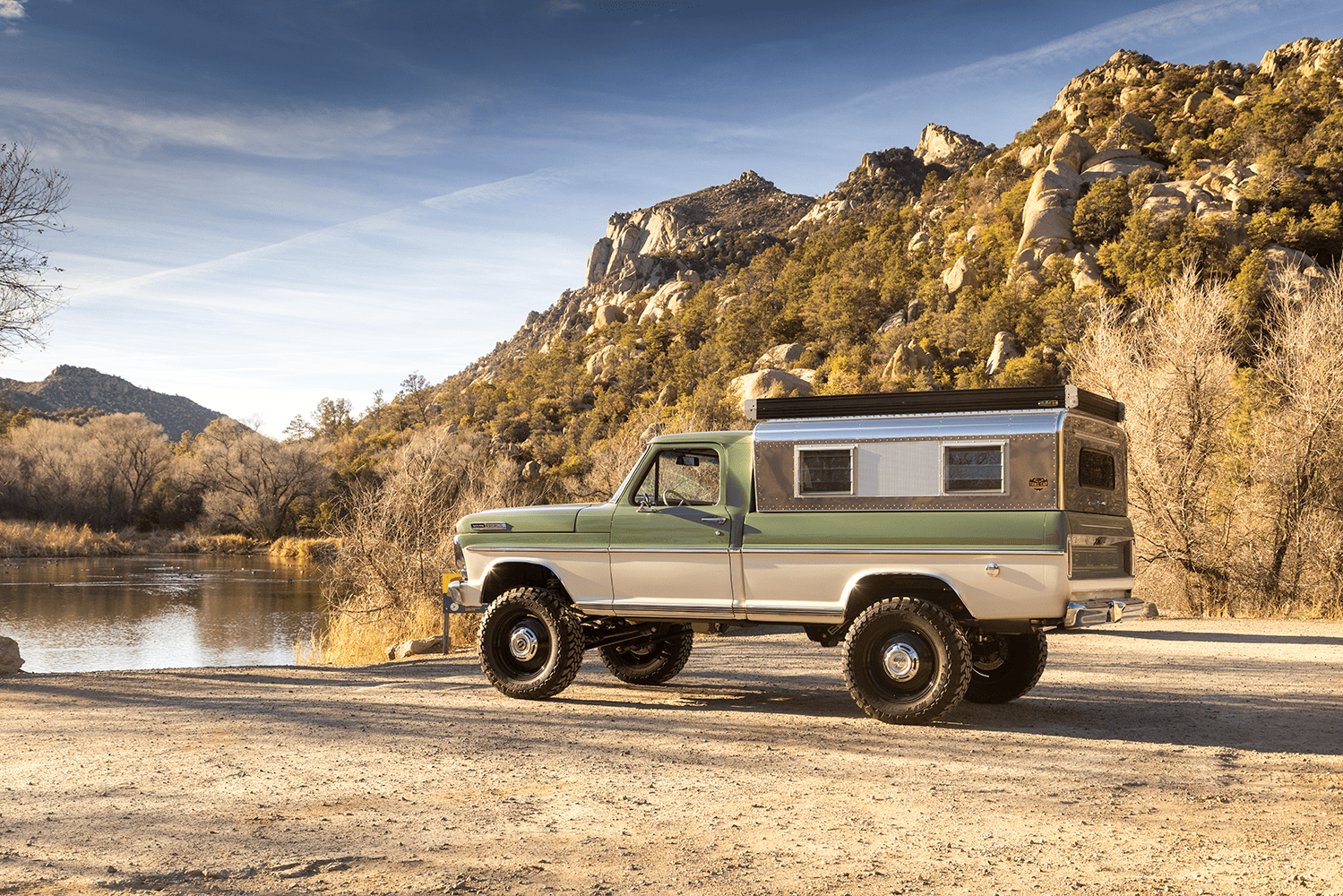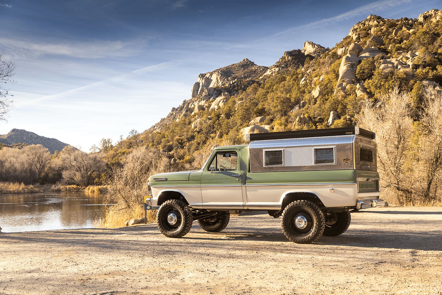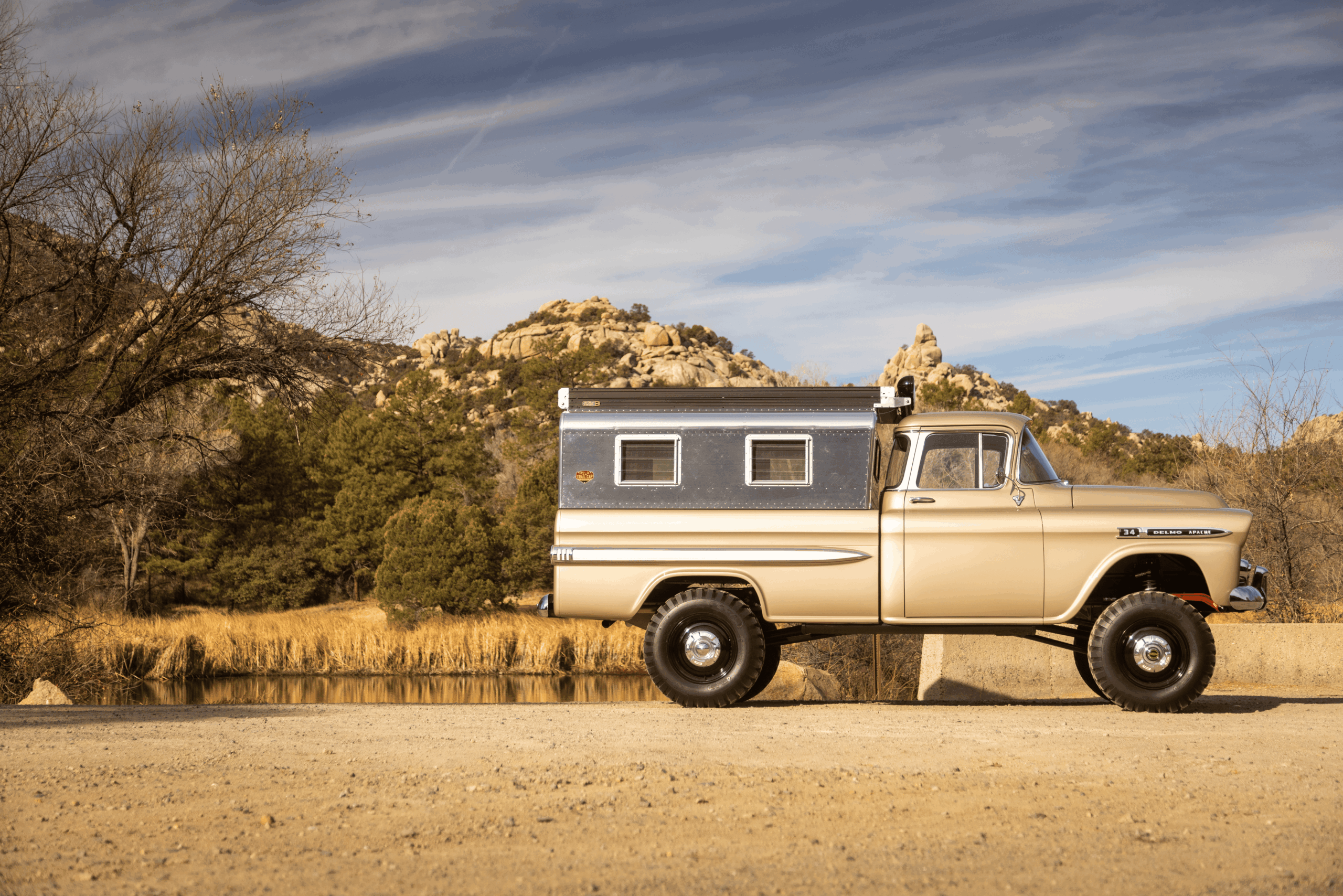 In case you were wondering about specifics, both the Apache and the Bumpside ride on custom “mid-length” (one of Del’s signature styling cues for the off-road design) Roadster Shop RS4 chassis with back-dated, Holley-fed LS3s—the Chevy using Delmo Speed adapters for a 283 inspiration while the Ford uses Delmo Speed adapters to achieve a 351W presence—and Hughes 4L80s with Atlas transfer cases and Dana 60/44 differentals. Wheels are custom steelie-look billets milled by Leading Edge Machine and Design (who also whittled the bitchin steering wheels in both trucks!) with Toyo Open Country 275/65s and Delmo-edition Baer disc brakes. Lewis Millinich handled the ’63 Corvette gold on the Apache, which is complemented by a retro Trail Cap aluminum camper shell; he refinished Eckberg’s F-250 in Boxwood Green and Wimbledon White two-tone, which is also outlandered-out with a Trail Cap rig. Also (now) local to Prescott, my good old friend from Austin via L.A. (or vice-versa), Sean “Fat Lucky” Johnstun crafted the beautiful interiors in both, which also feature Dakota Digital instrumentation, Vintage Air, and custom sound systems utilizing rearview mirror backup cams.