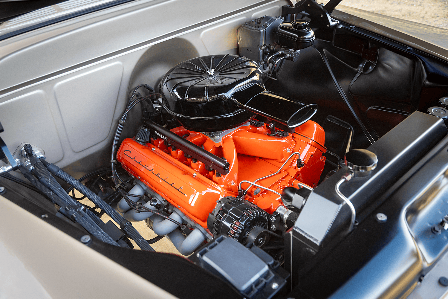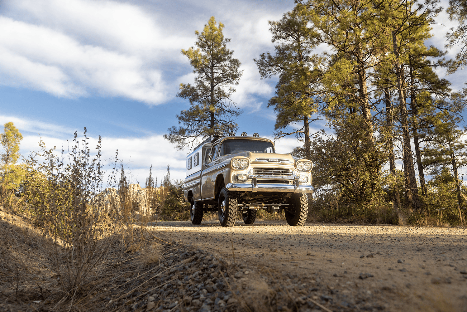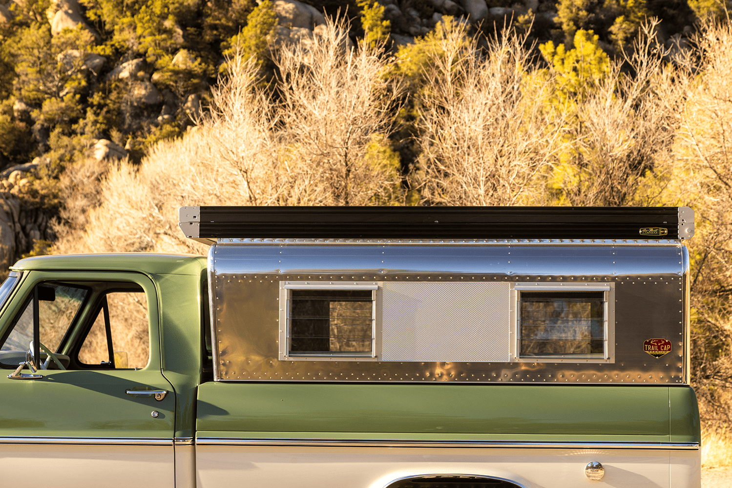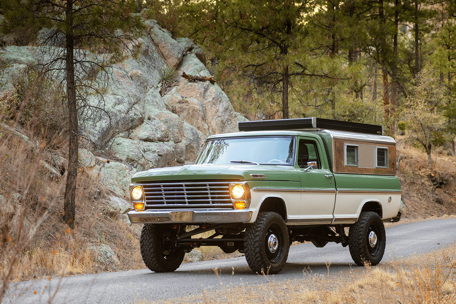 In case you were wondering about specifics, both the Apache and the Bumpside ride on custom “mid-length” (one of Del’s signature styling cues for the off-road design) Roadster Shop RS4 chassis with back-dated, Holley-fed LS3s—the Chevy using Delmo Speed adapters for a 283 inspiration while the Ford uses Delmo Speed adapters to achieve a 351W presence—and Hughes 4L80s with Atlas transfer cases and Dana 60/44 differentals. Wheels are custom steelie-look billets milled by Leading Edge Machine and Design (who also whittled the bitchin steering wheels in both trucks!) with Toyo Open Country 275/65s and Delmo-edition Baer disc brakes. Lewis Millinich handled the ’63 Corvette gold on the Apache, which is complemented by a retro Trail Cap aluminum camper shell; he refinished Eckberg’s F-250 in Boxwood Green and Wimbledon White two-tone, which is also outlandered-out with a Trail Cap rig. Also (now) local to Prescott, my good old friend from Austin via L.A. (or vice-versa), Sean “Fat Lucky” Johnstun crafted the beautiful interiors in both, which also feature Dakota Digital instrumentation, Vintage Air, and custom sound systems utilizing rearview mirror backup cams.