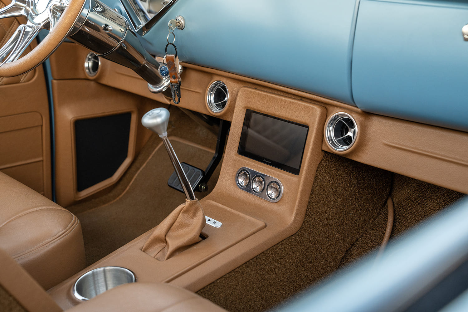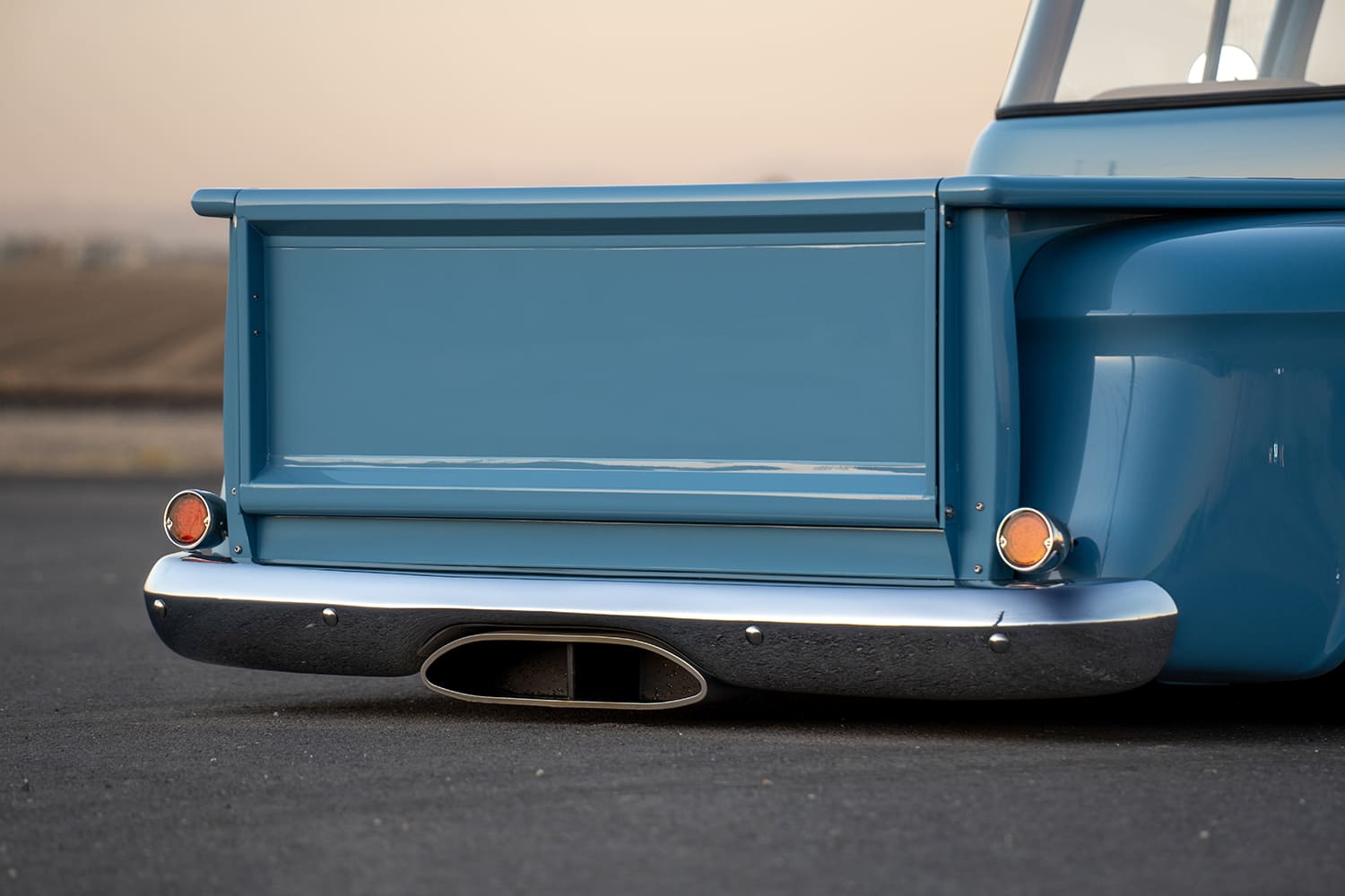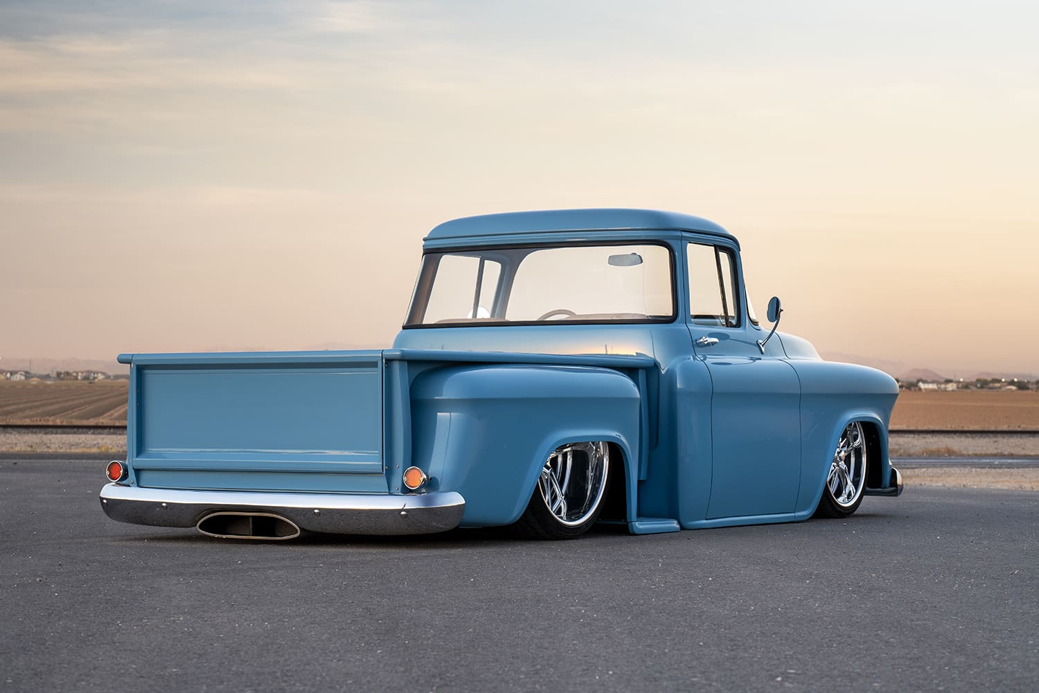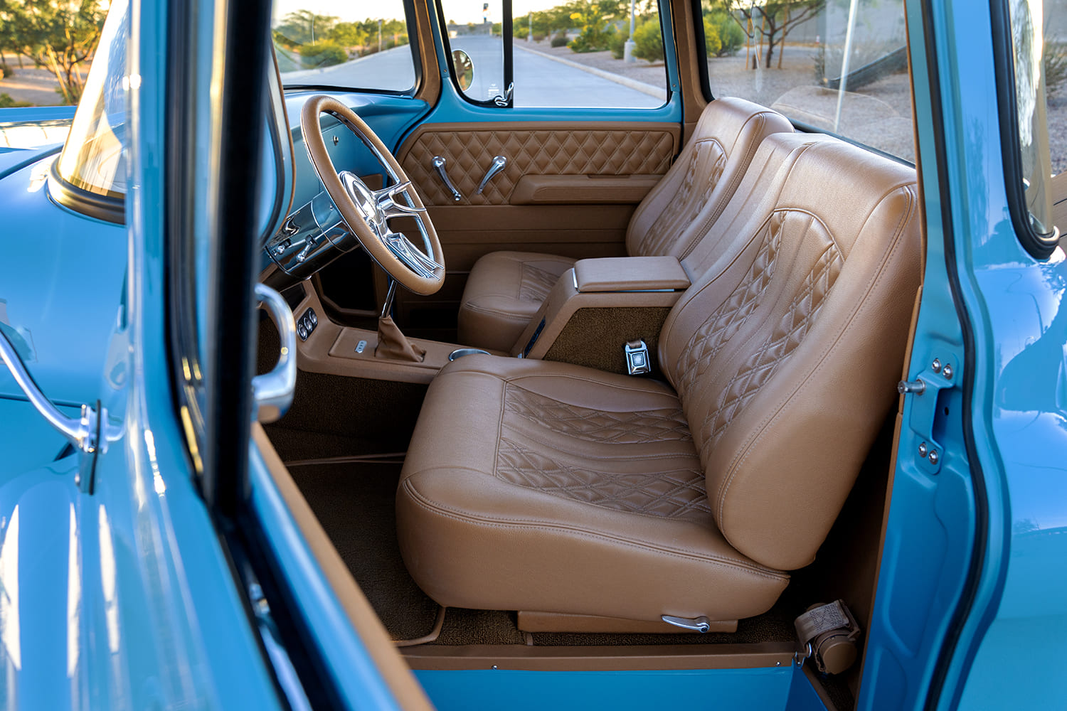 Atop that adjustable foundation, Tre5 puzzle-pieced the assemblage of aftermarket sheetmetal together, added some custom touches (new tubs, custom bed floorpan with Dakota Digital actuator-hinged centersection, shaved cowl, and so on), and fine-tuned everything before handing it off to iKandy Paintworks for Derek’s non-traditional color of choice: custom medium blue. Once the LMC Truck/UP Car Parts chrome and finished exterior details were added (lights, grille, and bumpers—including the exhaust-modified rear), it was up to Elevated Design to complete the interior using the aforementioned camel-colored leather over the Snowden seats and custom-made door/kick panels, and custom center console flowing into a full-length lower dash panel housing the Restomod Air components and Pioneer double-DIN display.
