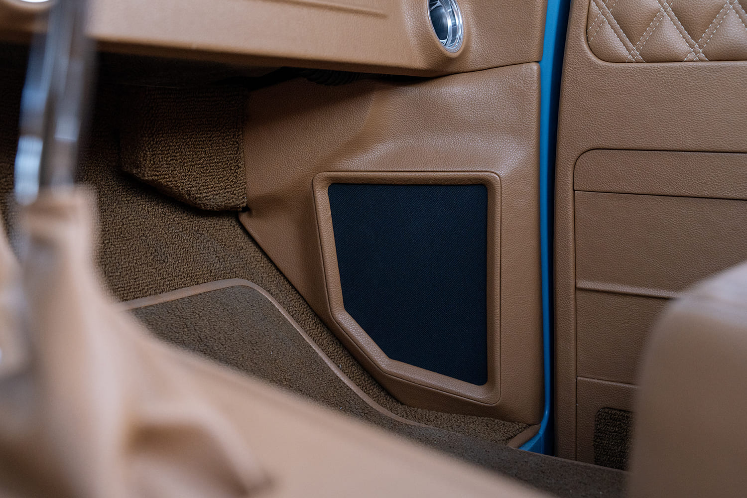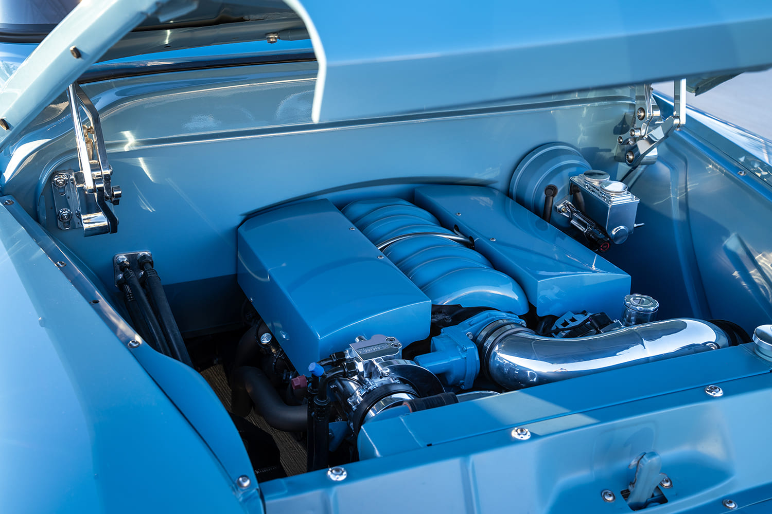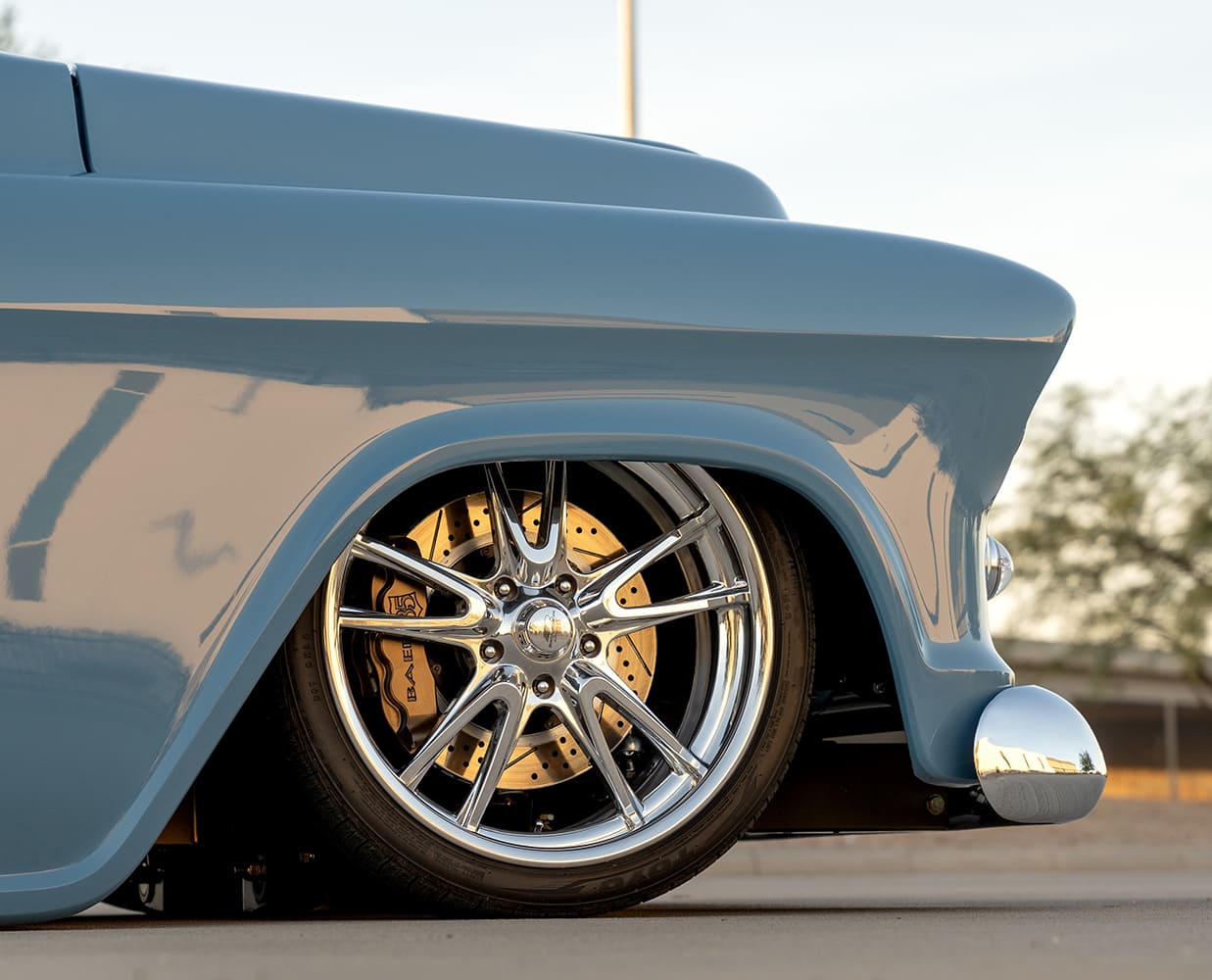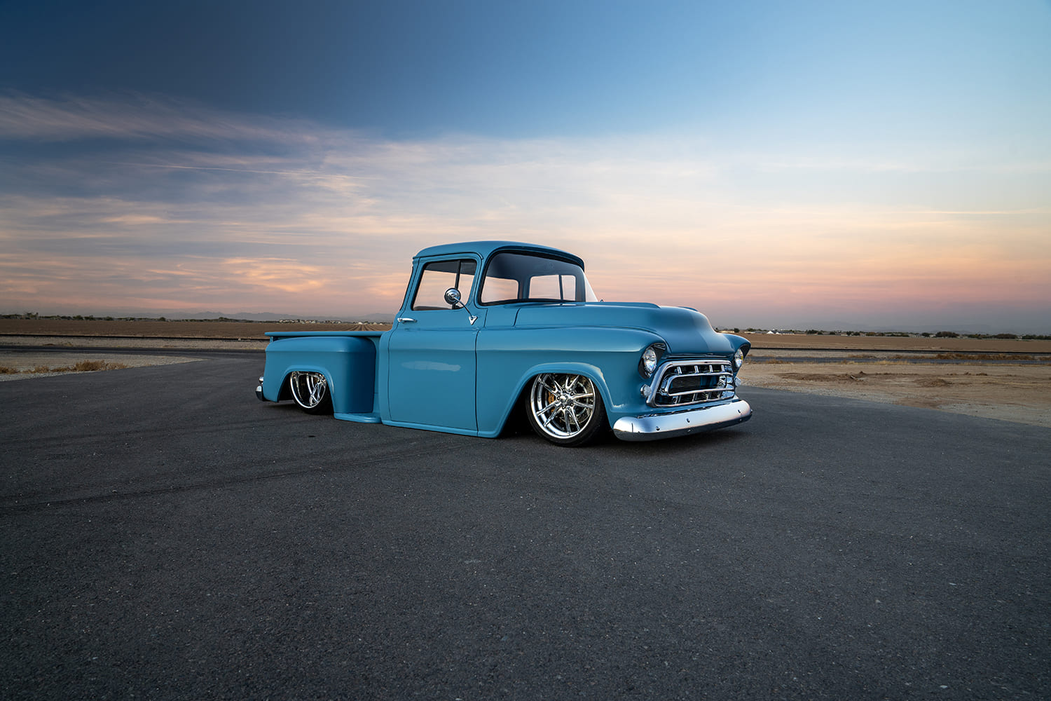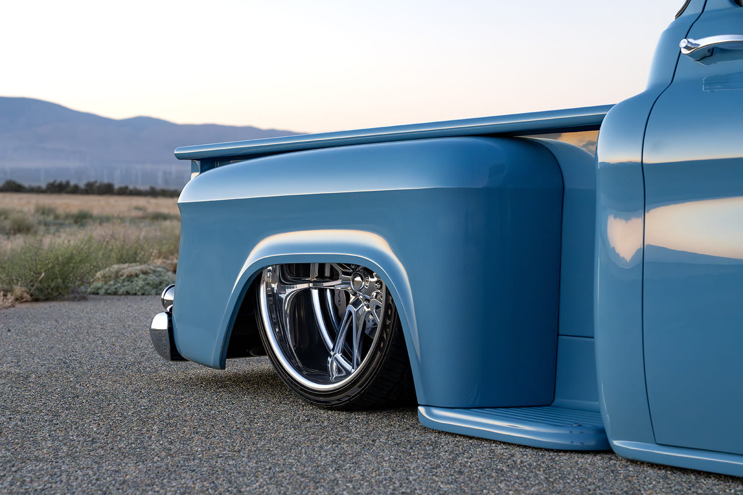 Atop that adjustable foundation, Tre5 puzzle-pieced the assemblage of aftermarket sheetmetal together, added some custom touches (new tubs, custom bed floorpan with Dakota Digital actuator-hinged centersection, shaved cowl, and so on), and fine-tuned everything before handing it off to iKandy Paintworks for Derek’s non-traditional color of choice: custom medium blue. Once the LMC Truck/UP Car Parts chrome and finished exterior details were added (lights, grille, and bumpers—including the exhaust-modified rear), it was up to Elevated Design to complete the interior using the aforementioned camel-colored leather over the Snowden seats and custom-made door/kick panels, and custom center console flowing into a full-length lower dash panel housing the Restomod Air components and Pioneer double-DIN display.