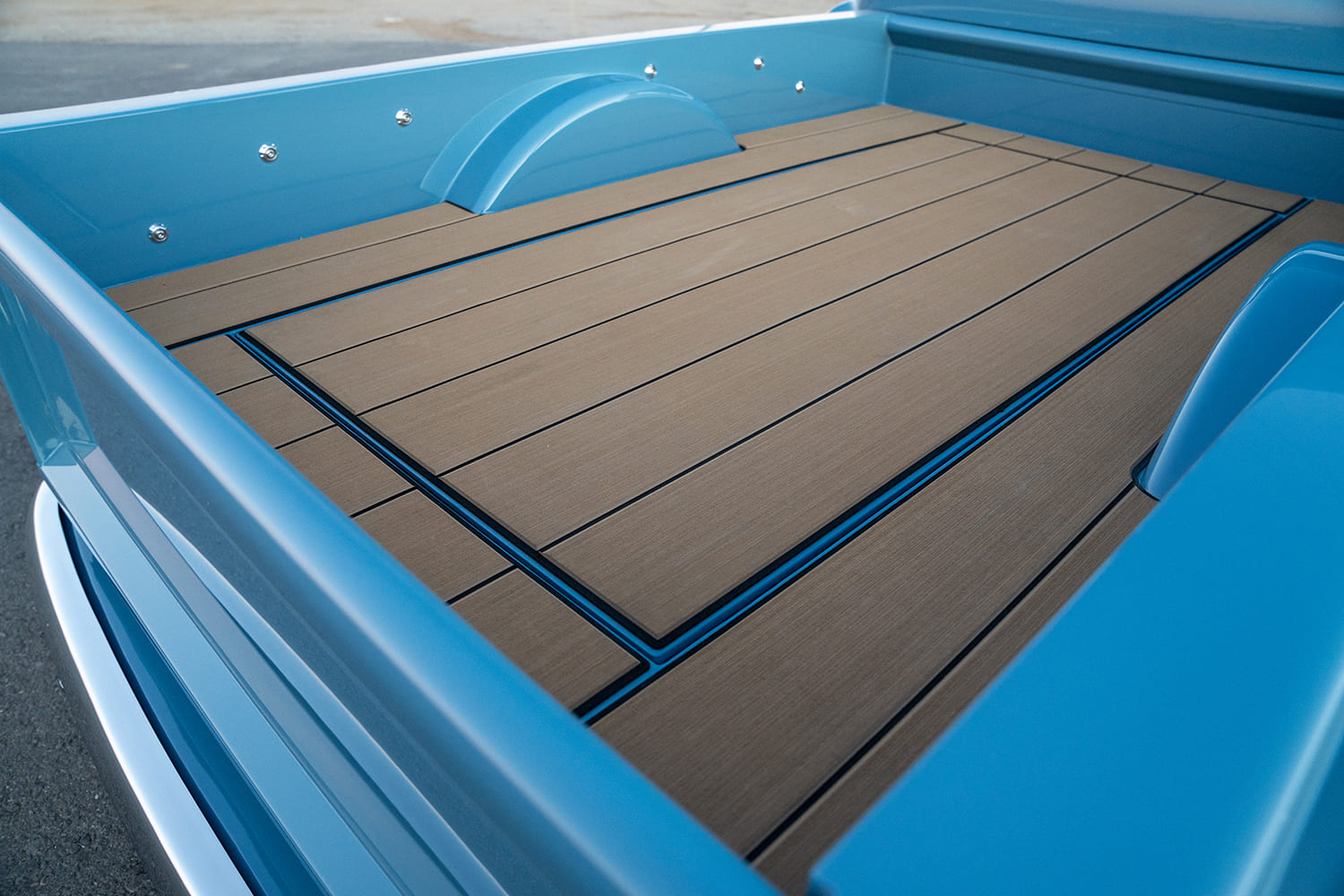 “I love having my ’69 C10, “Bruttus” (built by Tre5 Customs pre-pandemic), but when the opportunity came to buy this 1957 Chevy (which was a build started by someone else but needed to sell for personal reasons), I realized that I was ready to do another truck. I was excited to do something different. The ’57, aptly named Destitute, is completely different than Bruttus, most notably the motor; Bruttus has a big-block Chevy whereas Destitute is equipped with an LS3. As well, Bruttus is static-dropped and Destitute is on air ride. I definitely got out of my comfort zone when choosing the paint and interior for Destitute. Silver is my color of choice, but with a little prodding, the custom blue paint was chosen, and I couldn’t be happier with it. The color is probably the most-commented-on feature of the truck. The same day the paint was chosen, the interior color was picked as well. The camel interior and blue exterior contrast yet complement each other at the same time. When it came to the bed of the truck, I had already decided not to do the traditional wood. I went with SeaDek, a boat flooring. I installed it with the help of good friends and love how it turned out.