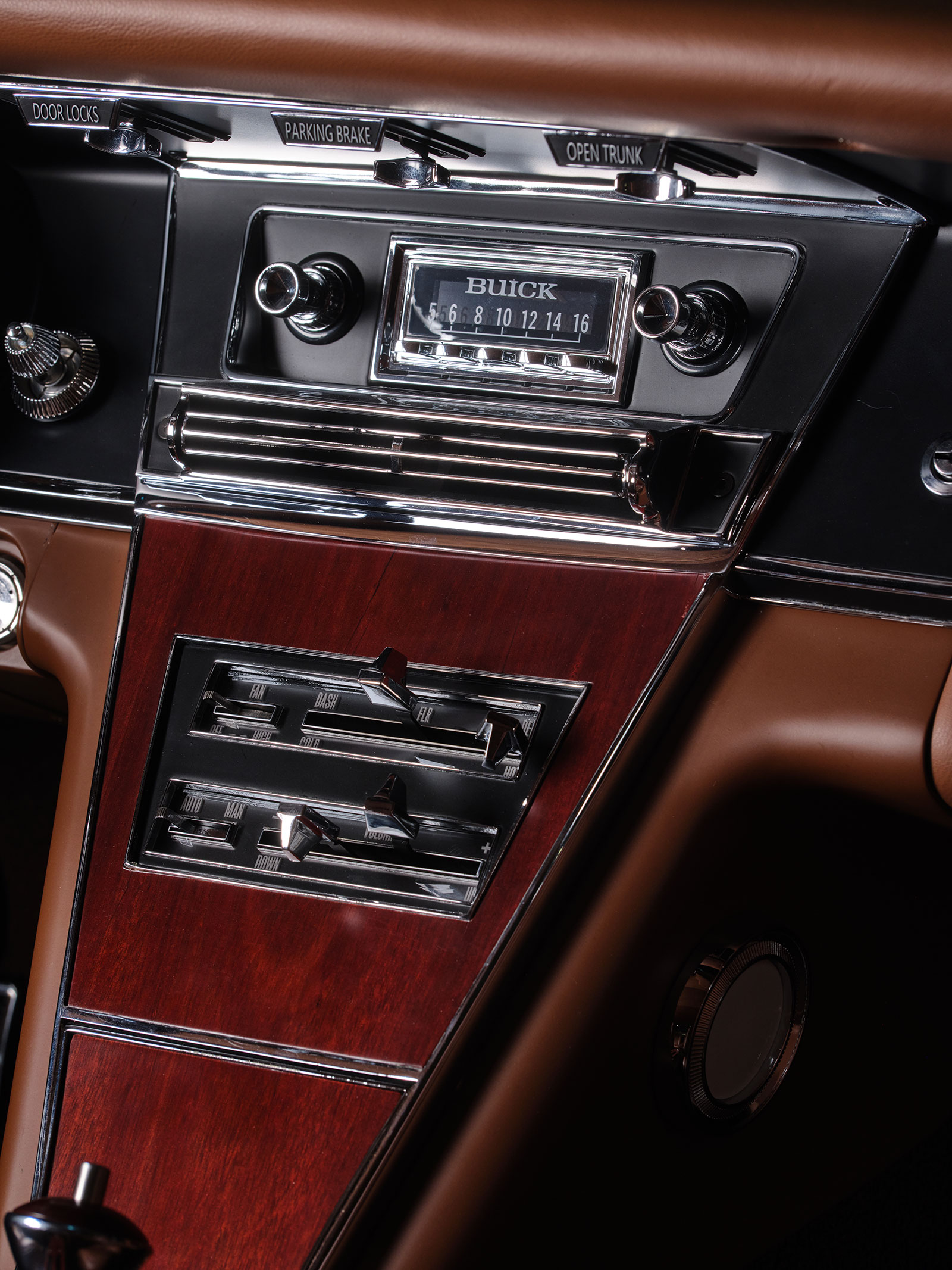 All of this is great but let’s face it, it’s the hustle underhood that makes a hot rod come to life. While there is nothing wrong with a vintage Buick Nailhead, many would say that’s exactly what should be there but not so for this ride. Delivered from Mast Motorsports is a Black Label LSX engine. The LS-based block comes by way of Chevrolet Performance, an LSX tall deck iron block equipped with Black Label aluminum heads. After the machining was handled by Mast Motorsports there was the ample use of ARP bolt, Diamond 12:1 pistons, and a Mast custom camshaft. The Nailhead-appearing valve covers are custom pieces machined by Greening Auto Company with the block painted in vintage Buick light blue. A single-plane Holley intake manifold is used along with a Holley EFI with a custom-fabricated air cleaner that’s reminiscent of the mid ’60s. The computer electronics are administered by a Holley Dominator system, along with GM coil packs, custom plug wires, and a YellowTop Optima battery. The slick-looking headers are made from 1-7/8-inch stainless that dump into Detroit Speed–fabricated 3-inch custom headers with Blackheart exhaust cutouts that then link to a pair of Hooker Blackheart mufflers. Other engine accessories include a Vintage Air Front Runner, GM starter, SPAL electric fan nestled within the factory appearing fan shroud (also machined at Detroit Speed), and a C&R oil cooler. Linked up to the 650-plus horsepower and 630-plus lb-ft of torque is a Bowler Performance 6L90E transmission with a Shiftworks shifter that maintains the original factory look and an Earl’s transmission cooler.
