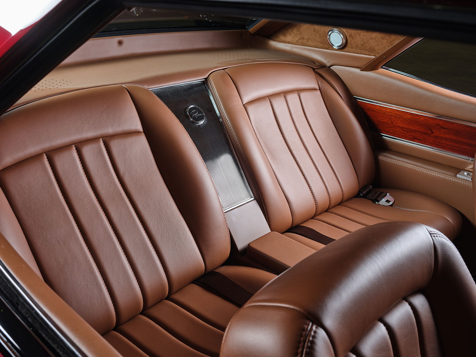 The bodywork and paint were performed at Detroit Speed with the use of PPG Ferrari Rosso Mugello Red as the selected color. (Rosso Mugello is Ferrari’s deep, almost maroon, red color. It was introduced on the 2004 Ferrari F430 and the 2007 Ferrari 599 GTO as well as on the 2019 Monza SP.) What brightwork there is was fittingly processed by Advanced Plating and beautifully accents the body lines and cleanly breaks up the bold color.